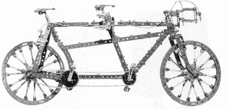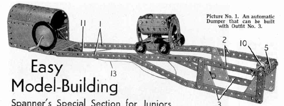 Продолжаем изучать материалы исходника, с которого создавался советский металлический конструктор- это наборы Английской фирмы MECCANO, популярные до сих пор. В их журналах для детей иногда мелькали реально безумные и шедевральные варианты сборок. Отметим, что и деталей для сборки требовалась масса, иногда даже не совсем стандартных.