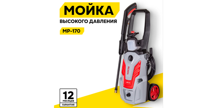 А теперь перейдем к разделу электрических моек высокого давления, для которых характерны более высокий напор и производительность, расширенный функционал и большие габариты. Начнем с модели РЕСАНТА МР-170. Мойка выполнена в надежном пластиковом корпусе, наделена большой ручкой и колесами для удобной транспортировки. Поэтому при весе прибора чуть менее 7 кг эксплуатация не вызывает затруднений. А длинный 8-метровый водяной шланг позволяет реже перемещать мойку во время работы. На корпусе предусмотрены держатели для сматывания шланга и удержания пистолета для обеспечения компактного хранения. В комплекте идет пеногенератор, а на корпусе есть место для его установки.
