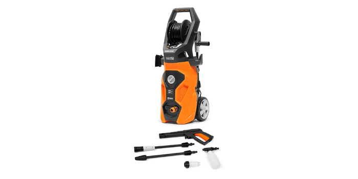 Модель выполнена в достаточно узком корпусе, снабжена большими колесами, удобной ручкой, длинным 5-метровым проводом и 8-метровым шлангом. На корпусе есть катушка для его удобного сматывания и хранения. Также хочу отметить расширенную комплектацию. Помимо пистолета, здесь есть насадка-распылитель, грязевая фреза, насадка-щетка, распылительная трубка и емкость для чистящего средства объемом 250 мл. Как и прочие участники, модель защищена от случайного включения.