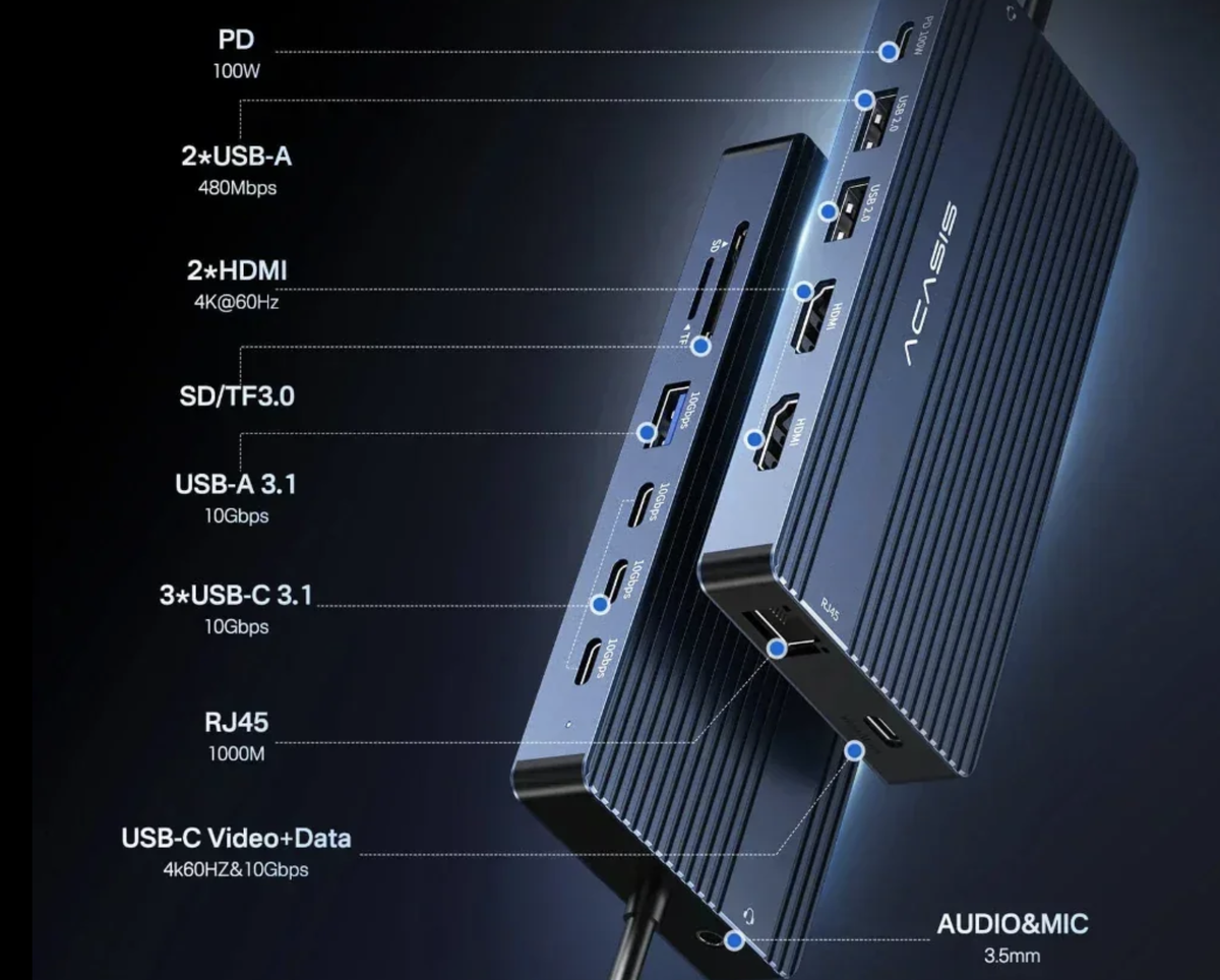 Универсальный хаб, превращающий один USB-C порт ноутбука в полноценную рабочую станцию. Она оснащена HDMI и DisplayPort (поддержка 4K 60 Гц), четырьмя портами USB 3.0, слотом для SD/microSD, портом Ethernet, разъёмом для наушников и даже слотами для SSD NVMe.
