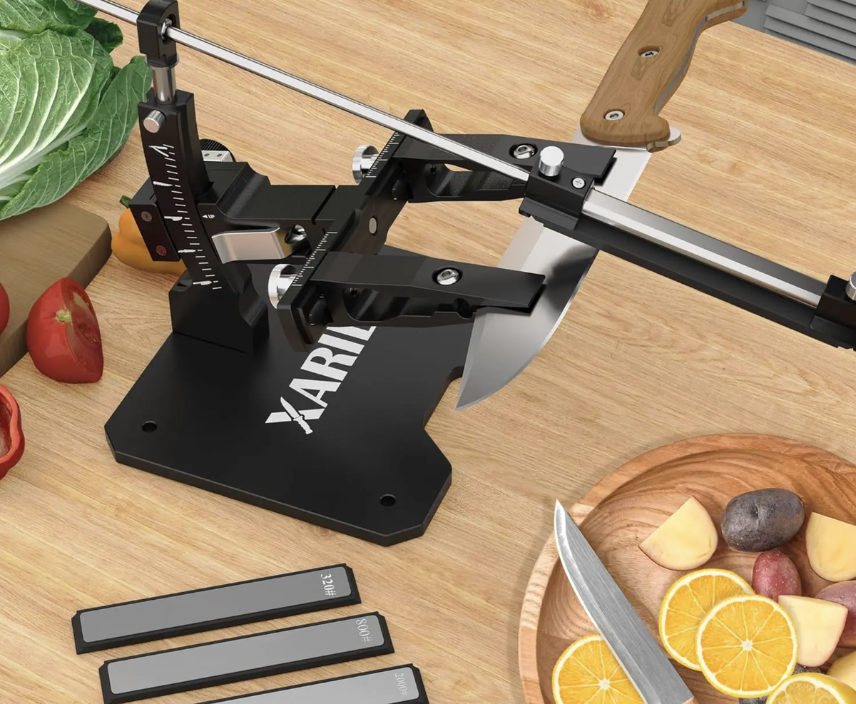 В комплект входят три алмазные пластины разной зернистости, которые справляются с тупыми и твердыми лезвиями, включая сталь высокой углеродистости и ножи для кухни.