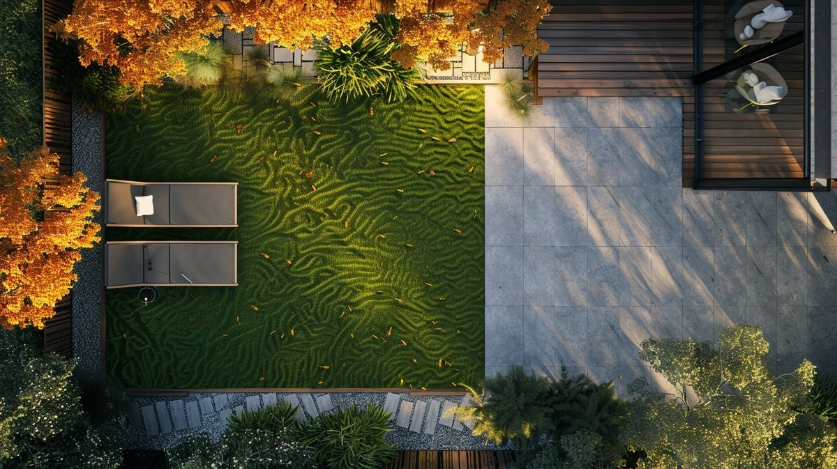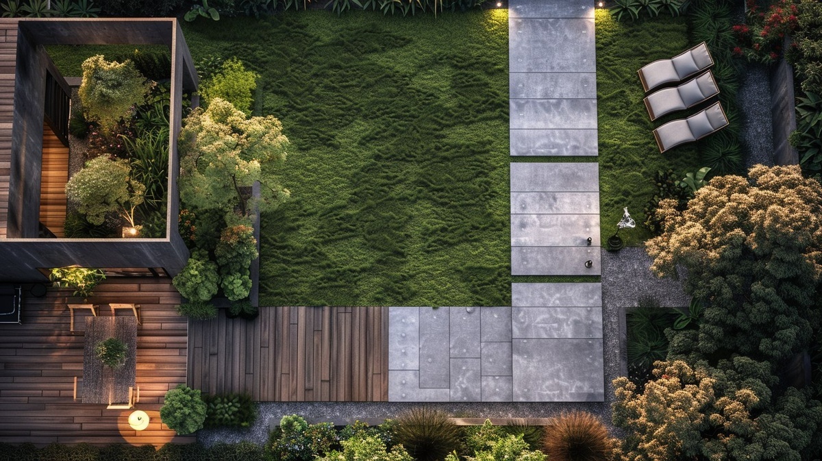 "Вид сверху на стильный минималистичный двор, 200 квадратных метров, прямоугольный газон, каменные дорожки, терраса из дерева, компактный водоем, местные растения, строгие линии —ar 16:9 —v 6"