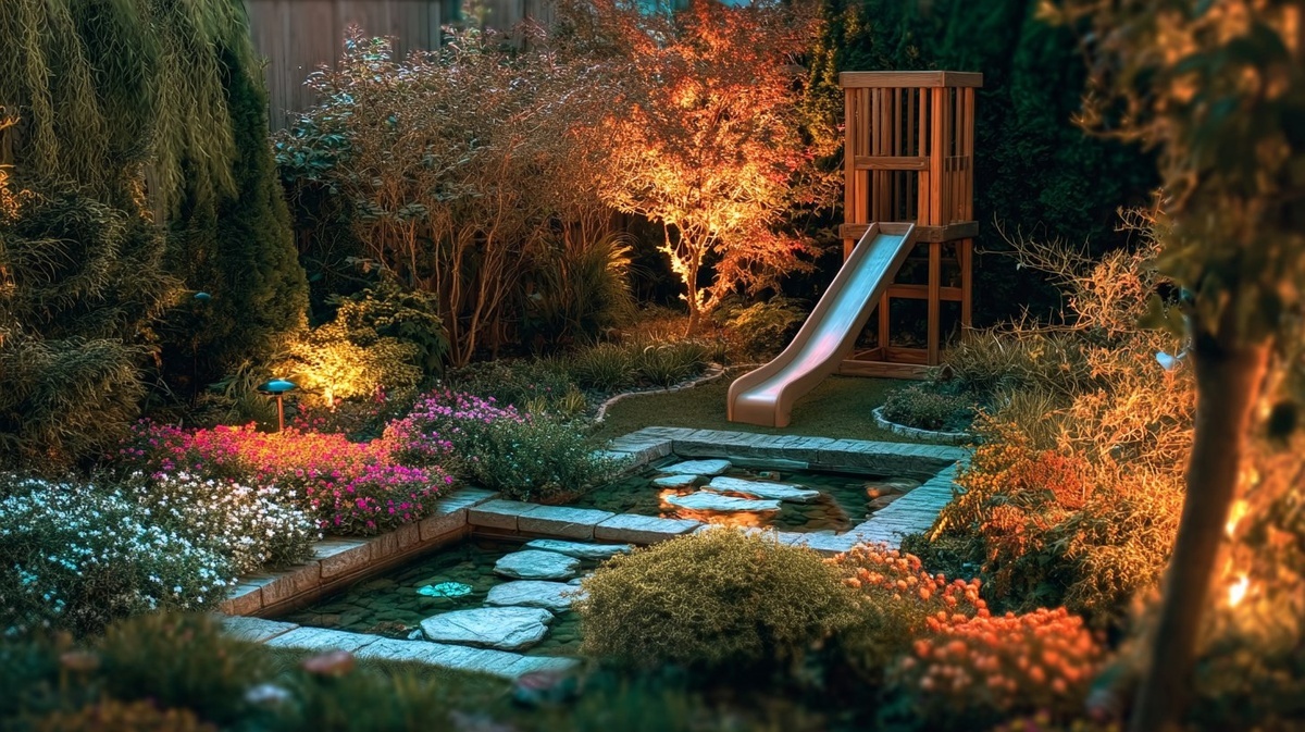 "Садовый пейзаж после заката, мягкое свечение дорожек, подсветка деревьев, сверкающий фонтан, теплое и спокойное настроение —ar 16:9"