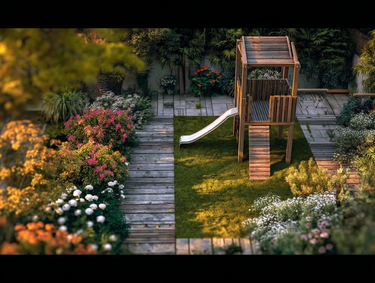 "Безопасная детская игровая зона во дворе, деревянный игровой комплекс, мягкое травяное покрытие, яркие цветники, тень от деревьев, оформление для семейного досуга —ar 4:3"