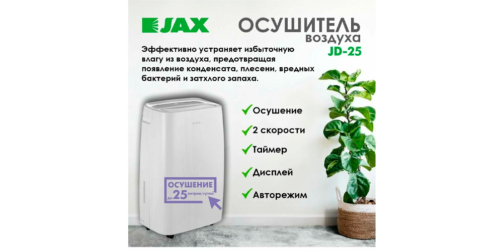На четвертой строчке рейтинга стоит напольный осушитель Jax JD-25, оборудованный удобными колесиками и интегрированными ручками по бокам для удобства перемещения по комнатам. Он предназначен для помещений порядка 25 кв. м и оснащен мощным компрессором, который обеспечивает быстрое, эффективное осушение со скоростью 25 л/сутки. При этом воздухообмен достигает 260 м3/ч. Бак для конденсата достаточно вместительный – 2 л.