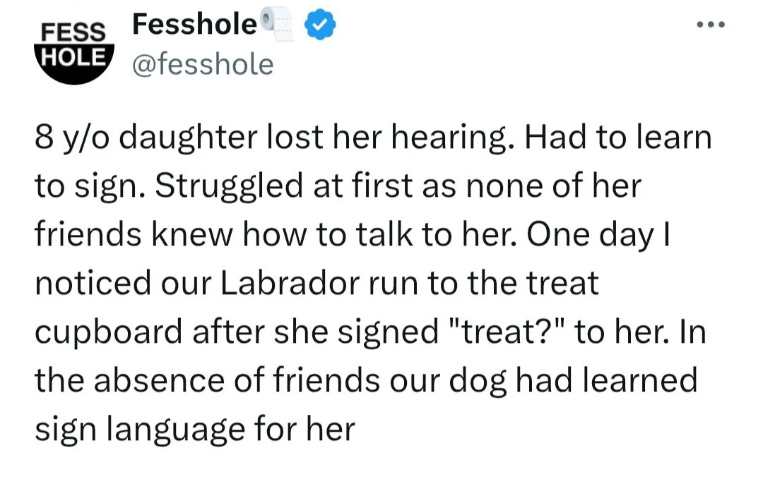 Моя 8-летняя дочь потеряла слух. Ей пришлось учить язык жестов. Сначала ей было тяжело, потому что никто из её друзей не знал, как с ней разговаривать. Однажды я заметил, как наш лабрадор побежал к шкафчику с лакомствами после того, как она показала жест «угощение?». В отсутствие друзей наш пёс сам выучил язык жестов ради неё.