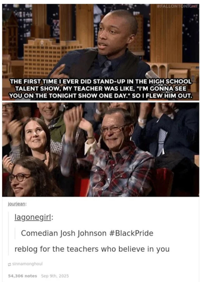«В первый раз, когда я выступал со стендапом на школьном конкурсе талантов, мой учитель сказал: «Я однажды увижу тебя на «The Tonight Show» (Мега популярное американское ночное ток-шоу — прим. переводчика). И вот — я пригласил его сюда.»