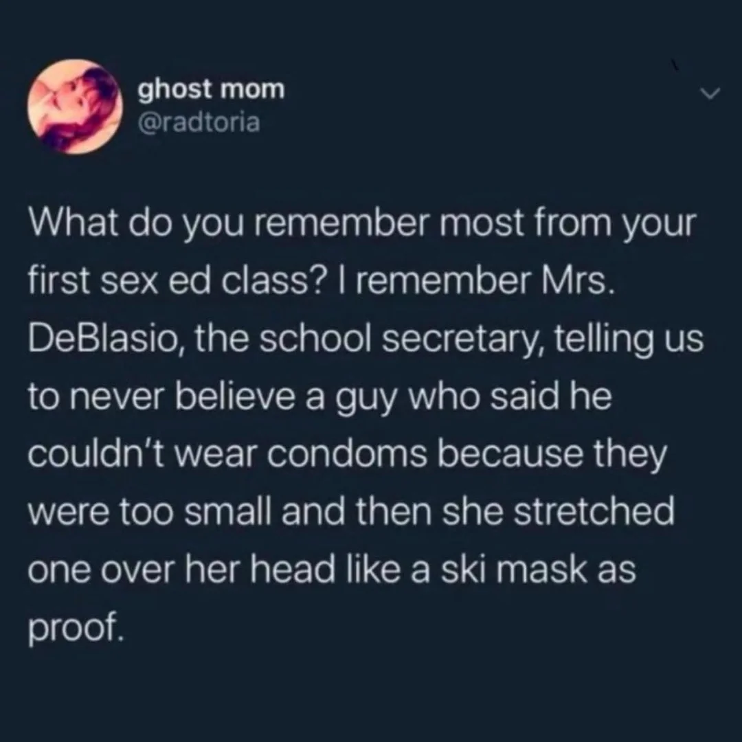 Я помню миссис ДеБлазио, школьного секретаря, которая говорила нам никогда не верить парням, утверждающим, что они не могут пользоваться презервативами, потому что те им малы — а затем она натянула один из них себе на голову, как лыжную маску, в качестве доказательства