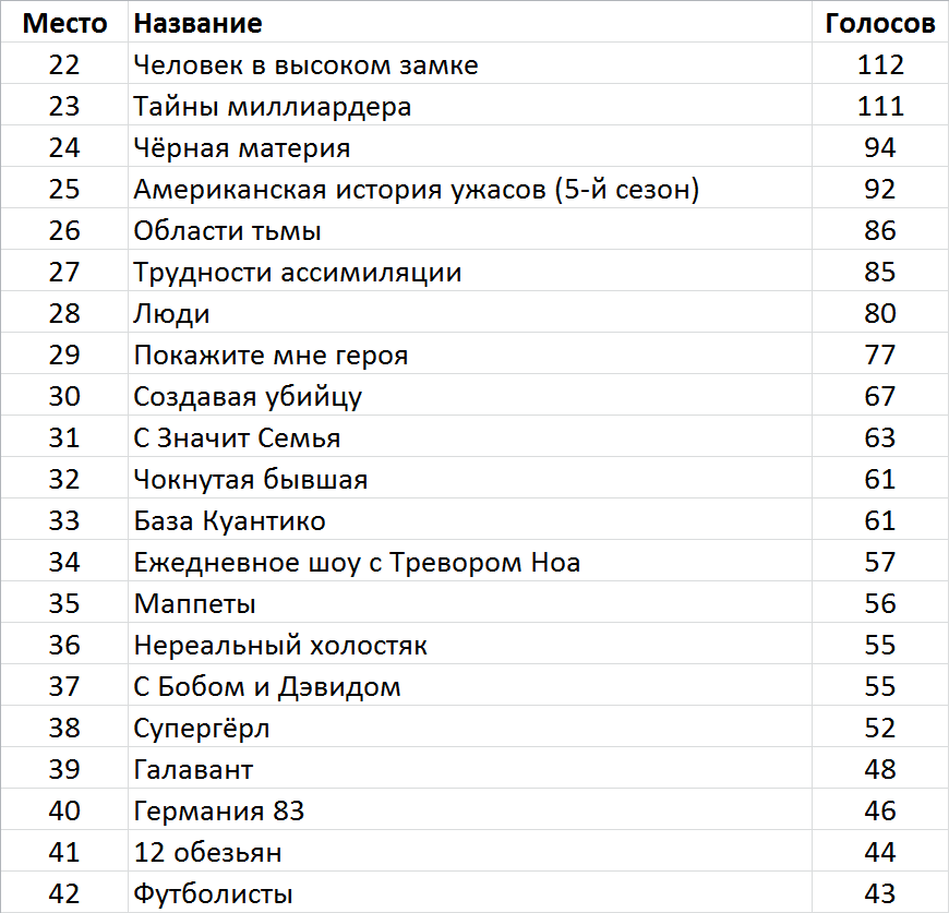 В таблице количество голосов по результатам опроса пользователей Reddit. Пятый сезон «Американской истории ужасов» был включён в опрос, так как этот сериал является антологией (сезоны не связаны с друг другом).