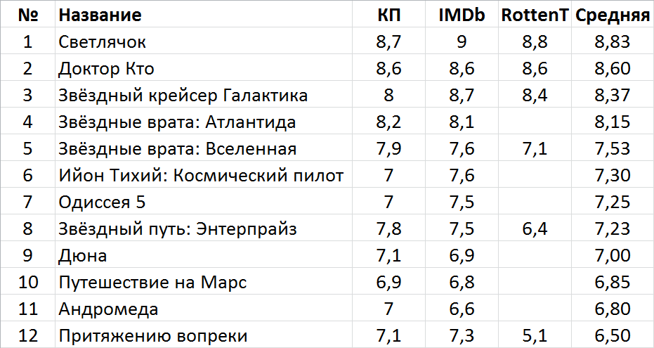 Таблица с рейтингами Кинопоиска, IMDb и Rottentomatoes.
