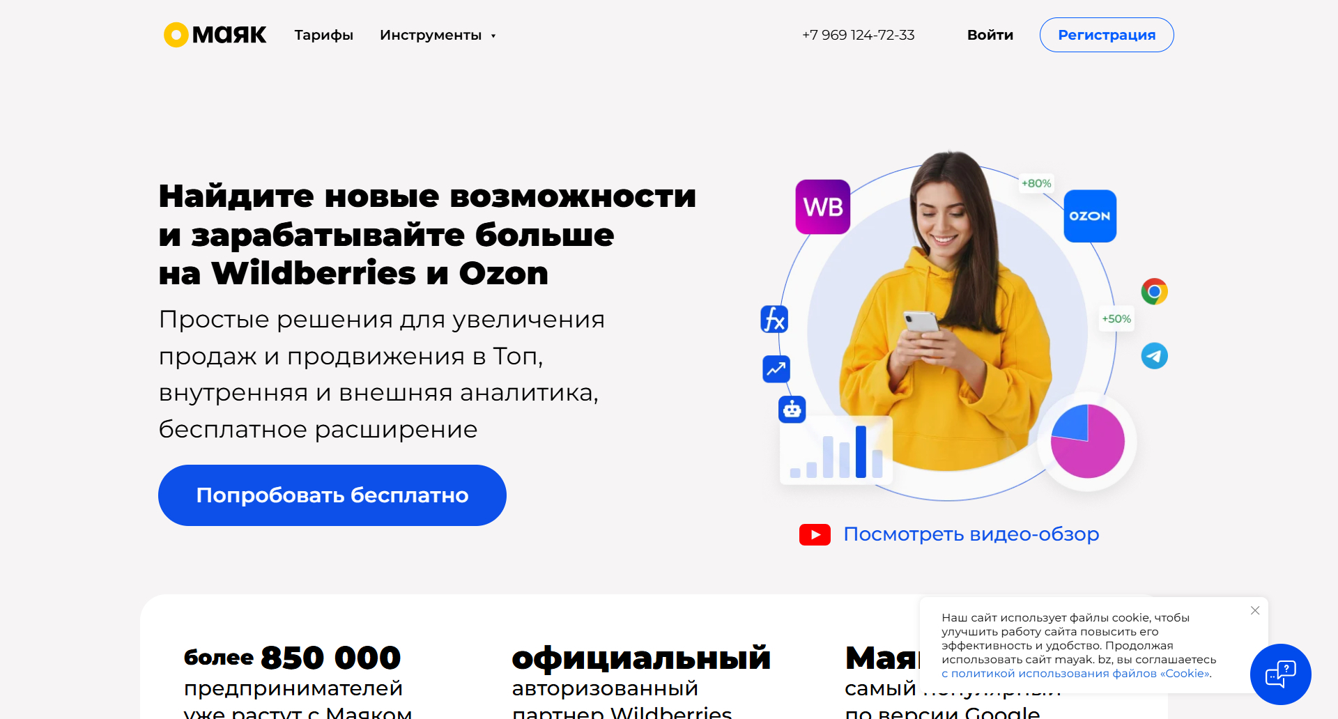 «Маяк» предлагает бесплатный доступ к базовым инструментам (в том числе расширение‑плагин), демо‑доступ на 3 дня для всех новых пользователей, а также вебинары, обучение и поддержку от экспертов и успешных селлеров .