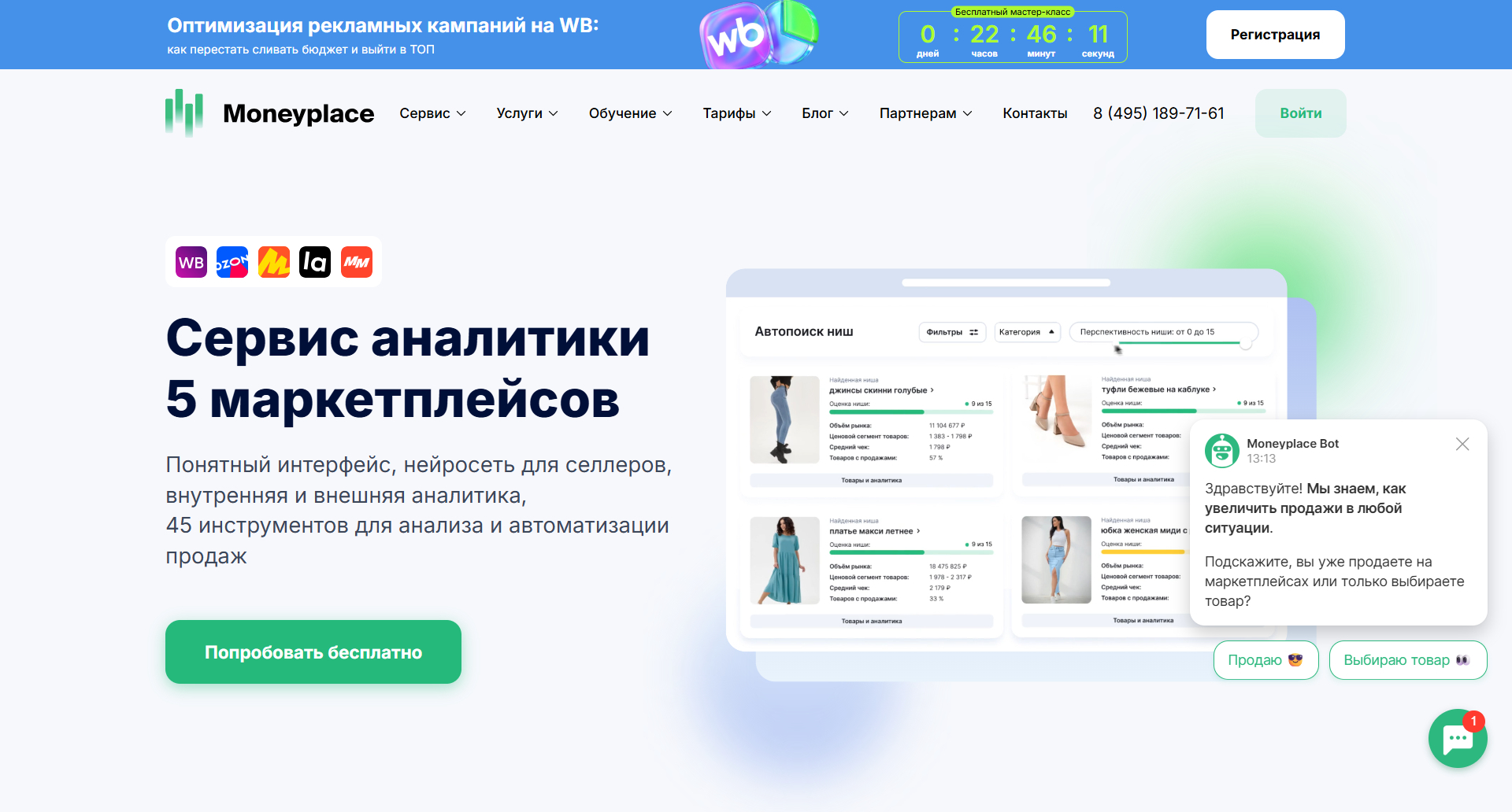 Moneyplace — мультифункциональный сервис для анализа и управления продажами на маркетплейсах Wildberries, Ozon, Яндекс.Маркет, Lamoda и Магнит.Маркет. Платформа предлагает более 45 инструментов: от нейросетевого подбора ниш и анализа конкурентов до bid‑менеджмента, автоответов на отзывы и AI‑генерации SEO‑описаний. Также доступна глубокая финансовая аналитика с расчётом рентабельности по SKU, отчётами и учётом затрат на рекламу, логистику и хранение.