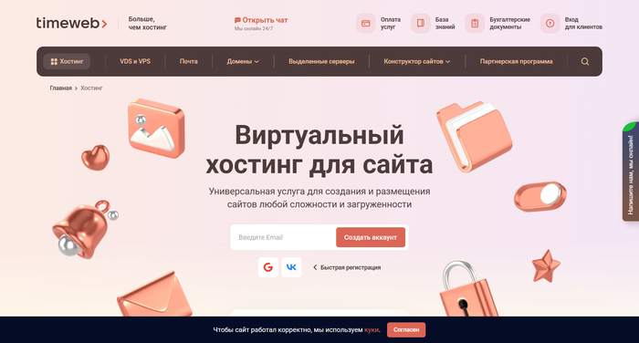 Timeweb предлагает виртуальный хостинг, который подойдёт как для небольших проектов, так и для масштабных ресурсов с высокой посещаемостью. Пользователи могут выбрать один из нескольких тарифных планов с различными лимитами по объёму SSD-накопителей, количеством сайтов и баз данных. Все тарифы включают бесплатный SSL-сертификат и ежедневное резервное копирование данных.