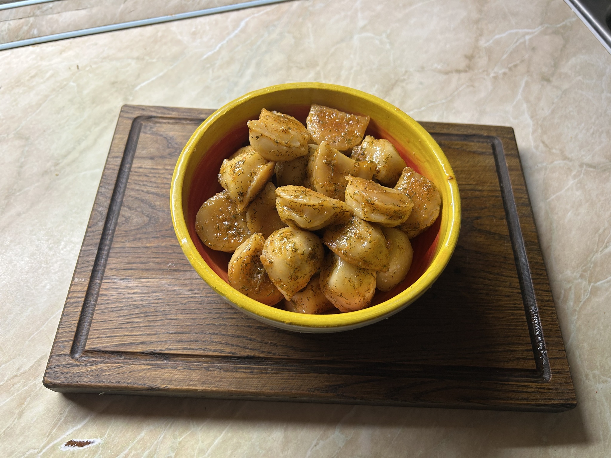Когда пельмешки будут равномерно обжарены, обвалены в специях и "загоревшие", кидаем в тарелку и бежим есть, с любимыми топпингами, типо сметаны, я сам например спокойно и с удовольствием, поедаю их без всего: