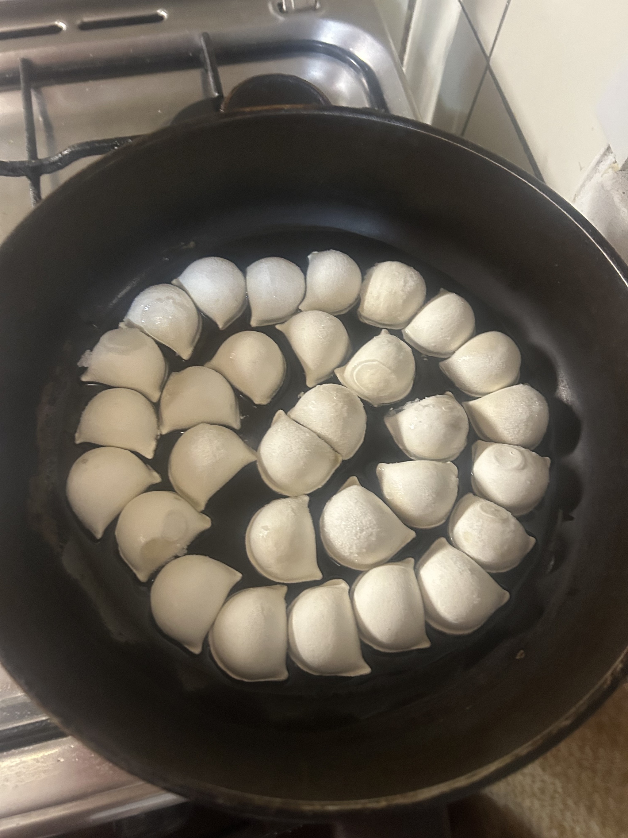 Берем сковороду, на холодную наливаем на наше масло и сверху выгладываем в один слой, все наши пельмени, строго на одну сторону, пельмени могу соприкасаться с друг-другом, но все должны лежать самой плоской стороной строго в масле.