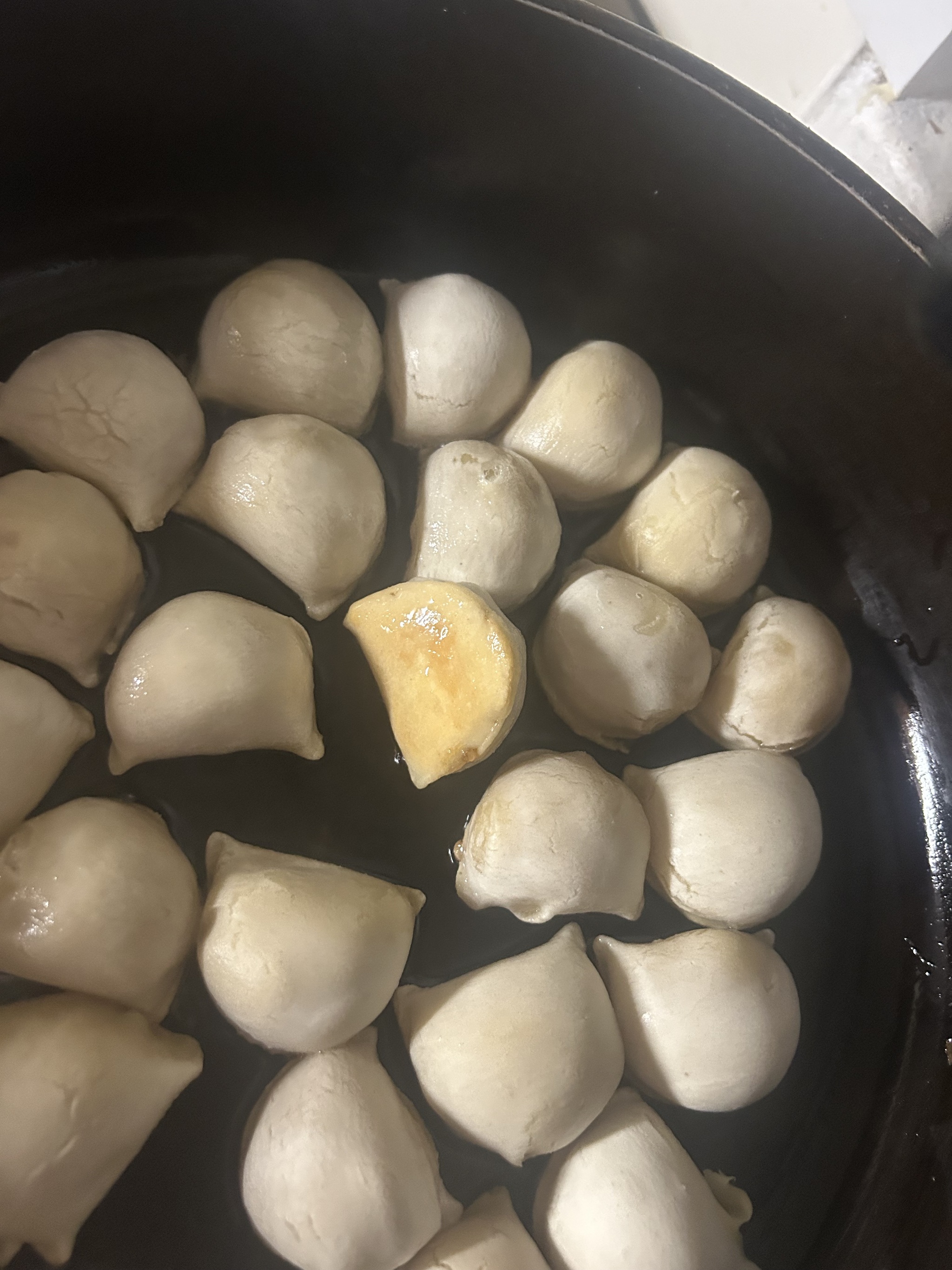 Под конец таймера, выбираем одну из пельмех и иногда переворачиваем и смотри что с нижней стороной, она должна стать аппетитно румяной как на фото ниже.