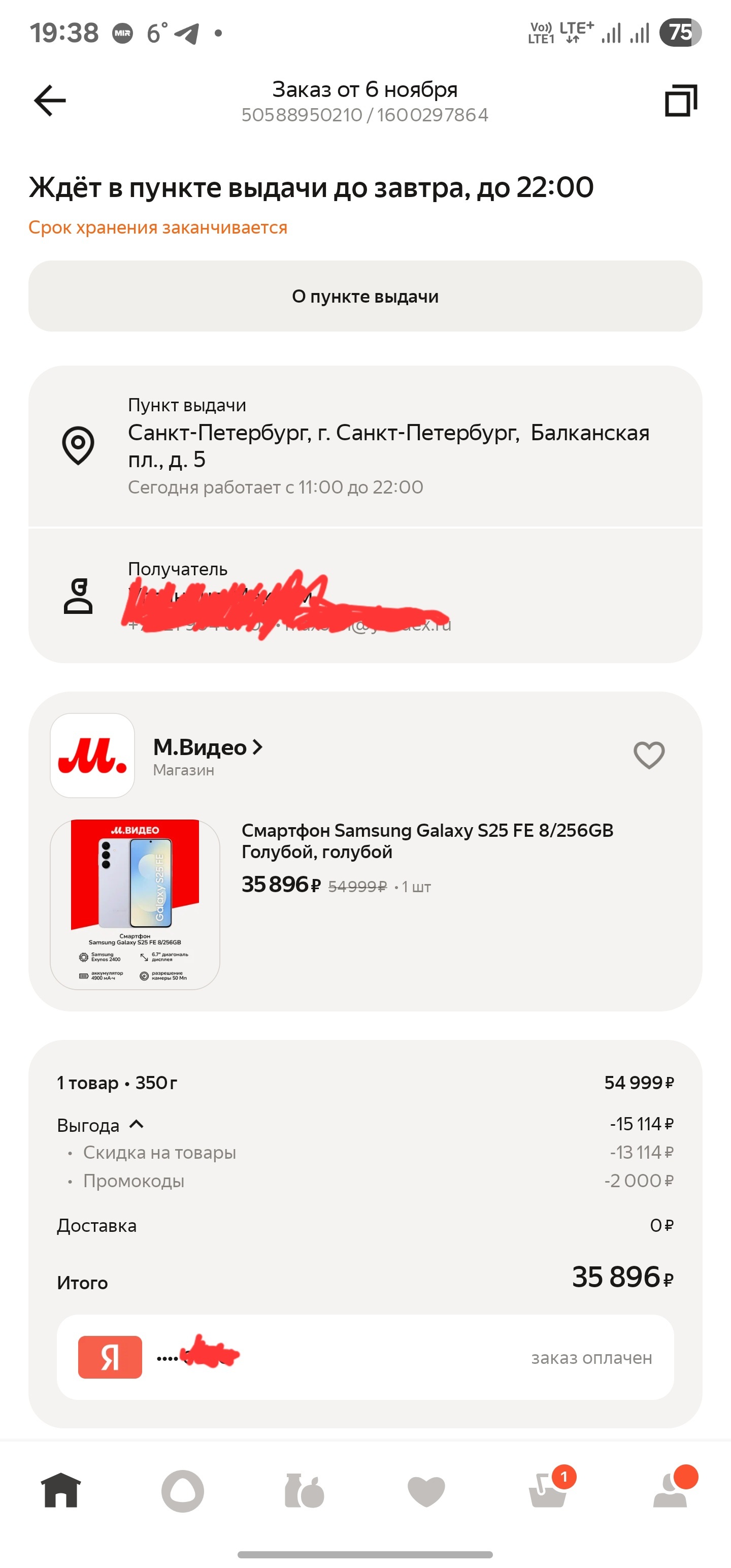 Оформил 6 ноября заказ на я.маркете продавец м.видео заказ с Samsung s25fe 256. За 35 удалось взять. 7ого или 8ого пришло уведомление, что заказ готов к выдаче до 14.11 22:00.