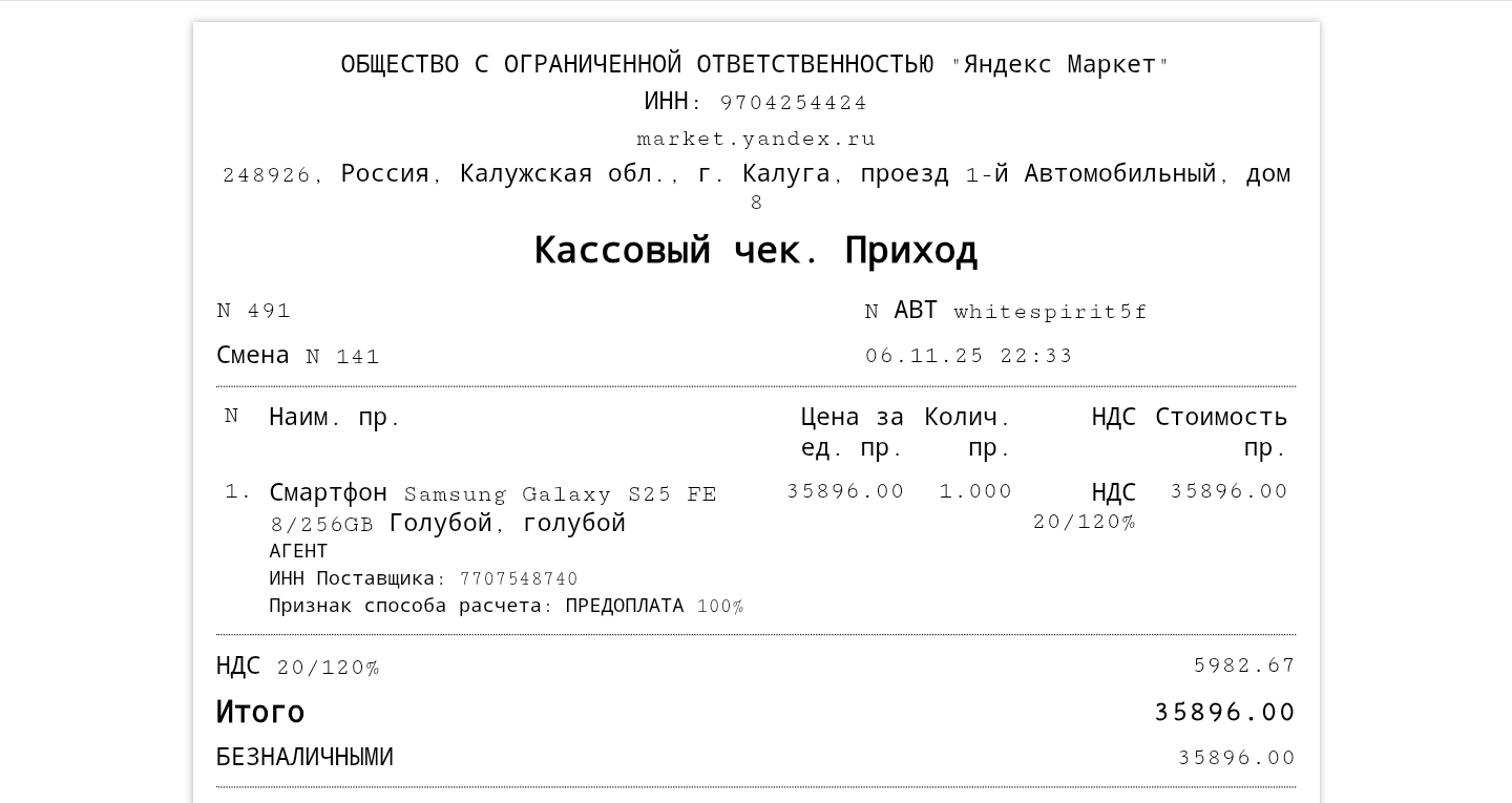 "Лучший сервис" Яндекс.Маркета покупка от 6.11.2025 телефона