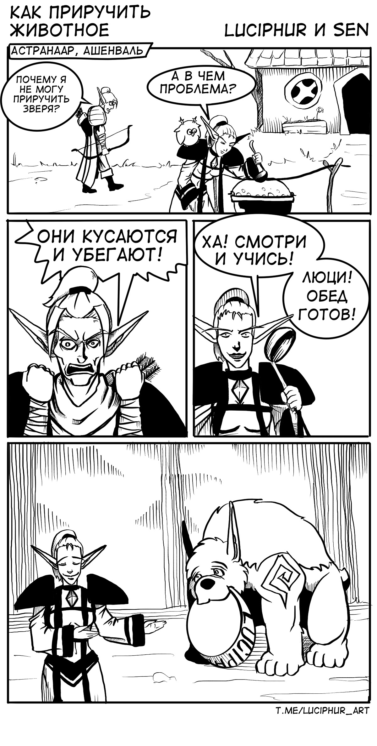 В случае охотника - про которого и будет наш сегодняшний комикс - своего пета надо приручить. И именно это не получалось у нашего нового героя. А вот у Сен, хотя она и не охотник, ручной медведь-танк всегда под рукой.
