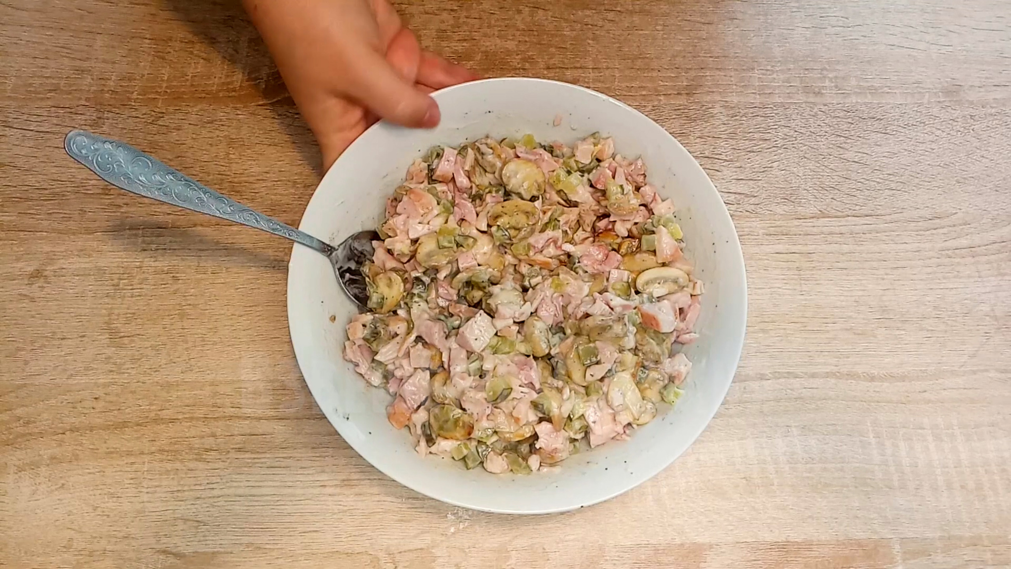Для начала необходимо приготовить салат, который мой супруг назвал «Лесной охотник». С двух копченых окорочков снимите мясо (кожу и кости удалите), нарежьте небольшими кубиками (копченую курицу можно заменить любым другим мясом: жареной говядиной, копченой колбасой, отварной куриной грудкой). 3 соленых огурчика тоже нарежьте кубиком. 250г шампиньонов обжарьте на растительном масле до золотистого цвета. Все три ингредиента смешайте с добавлением 100г легкого майонеза (20% жирности) и черного перца по вкусу.