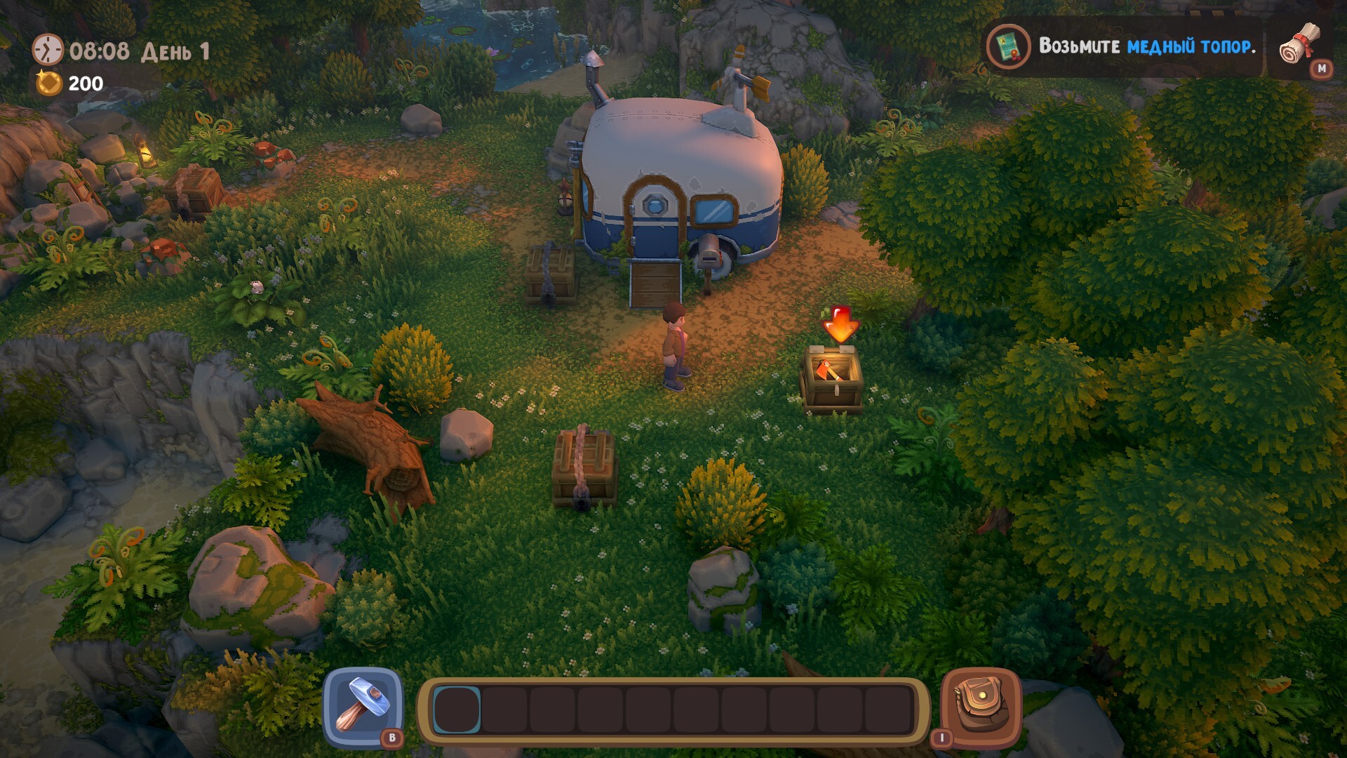 Вокруг стартового дома-фургончика разбросаны ящики с припасами, их заберём в процессе недолгого обучения. Тут подскажут как собирать ресурсы, строить и так далее.