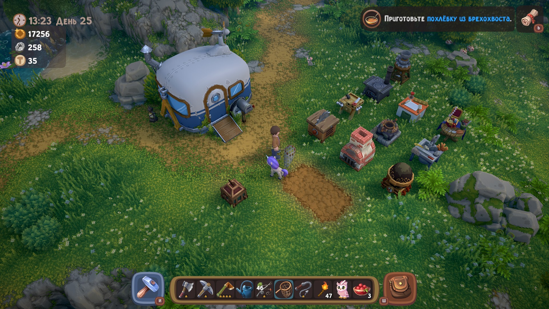 В итоге, около моего дома-фургона образовался целый крафтовый городок из производящих станций. И это ещё я только три из семи профессий начал изучать. Что будет дальше — страшно и представить. Впереди фермерство, разведение животных, ювелирное дело, создание древних артефактов и прочее.