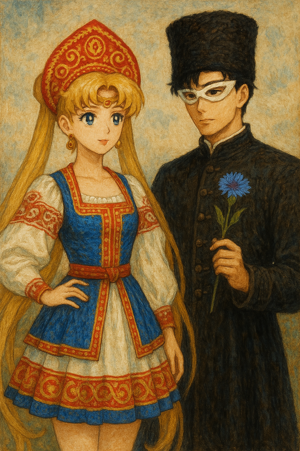 Промпт: Сейлор Мун в русском бело-синем сарафане с короткой юбкой и с красным кокошником и Такседо Маск в чёрном кафтане и с васильком (вместо розы) в руках, Аниме стиль рисунка, с оттенками стиля Васнецова