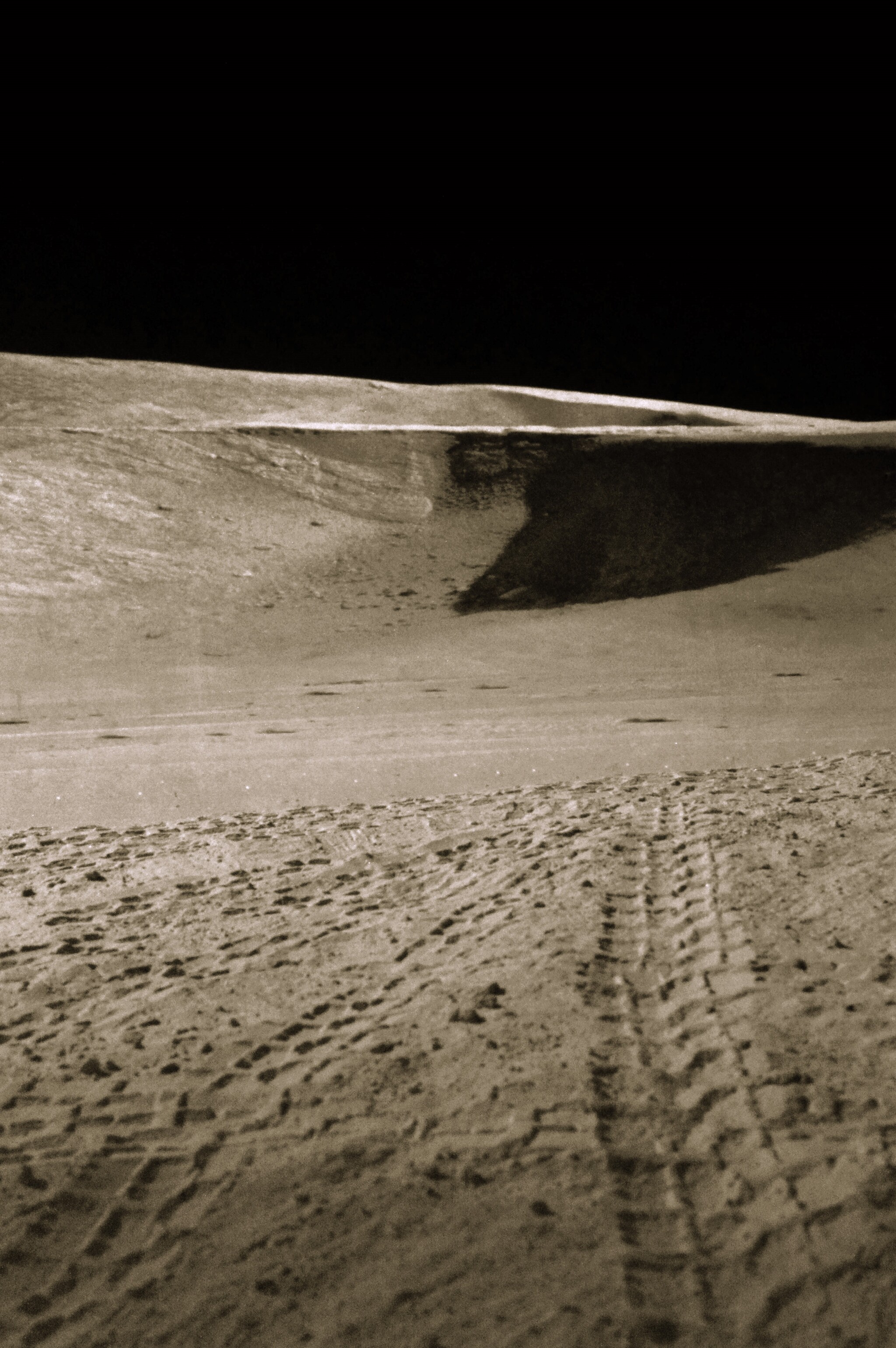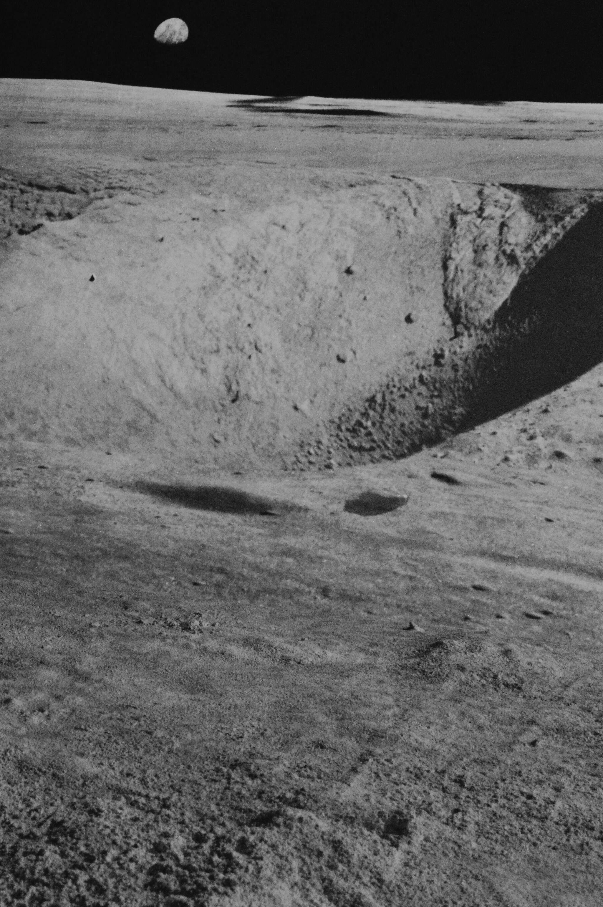 Лунные кратеры. Астронавтам было строго запрещено спускаться в лунные кратеры поэтому следы колес лунного ровера обрываются на большом удалении от края лунной бездны. Но когда астронавты ходили пешком они брали на себя смелость подходить к самому краю кратера.