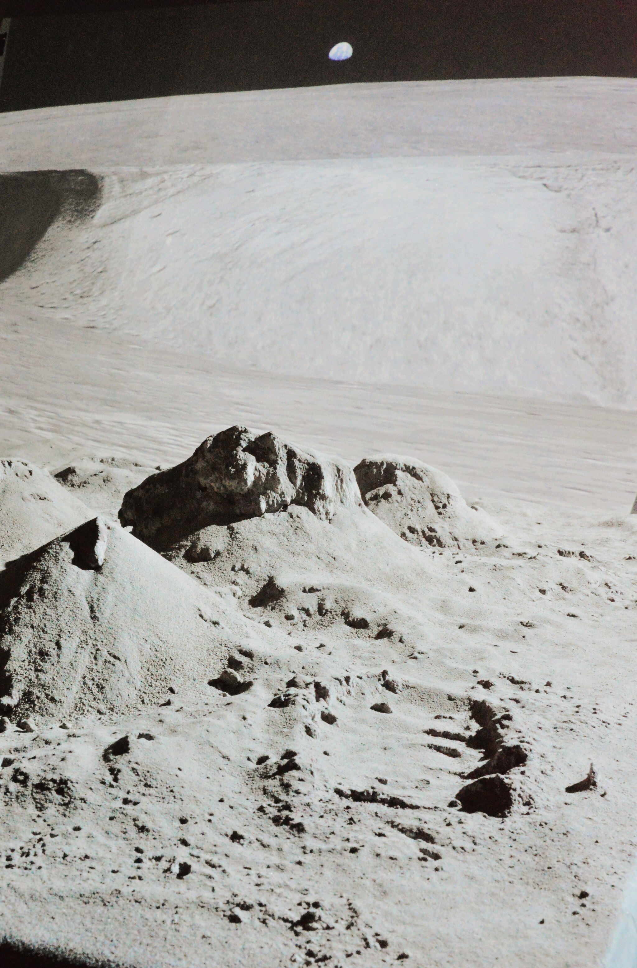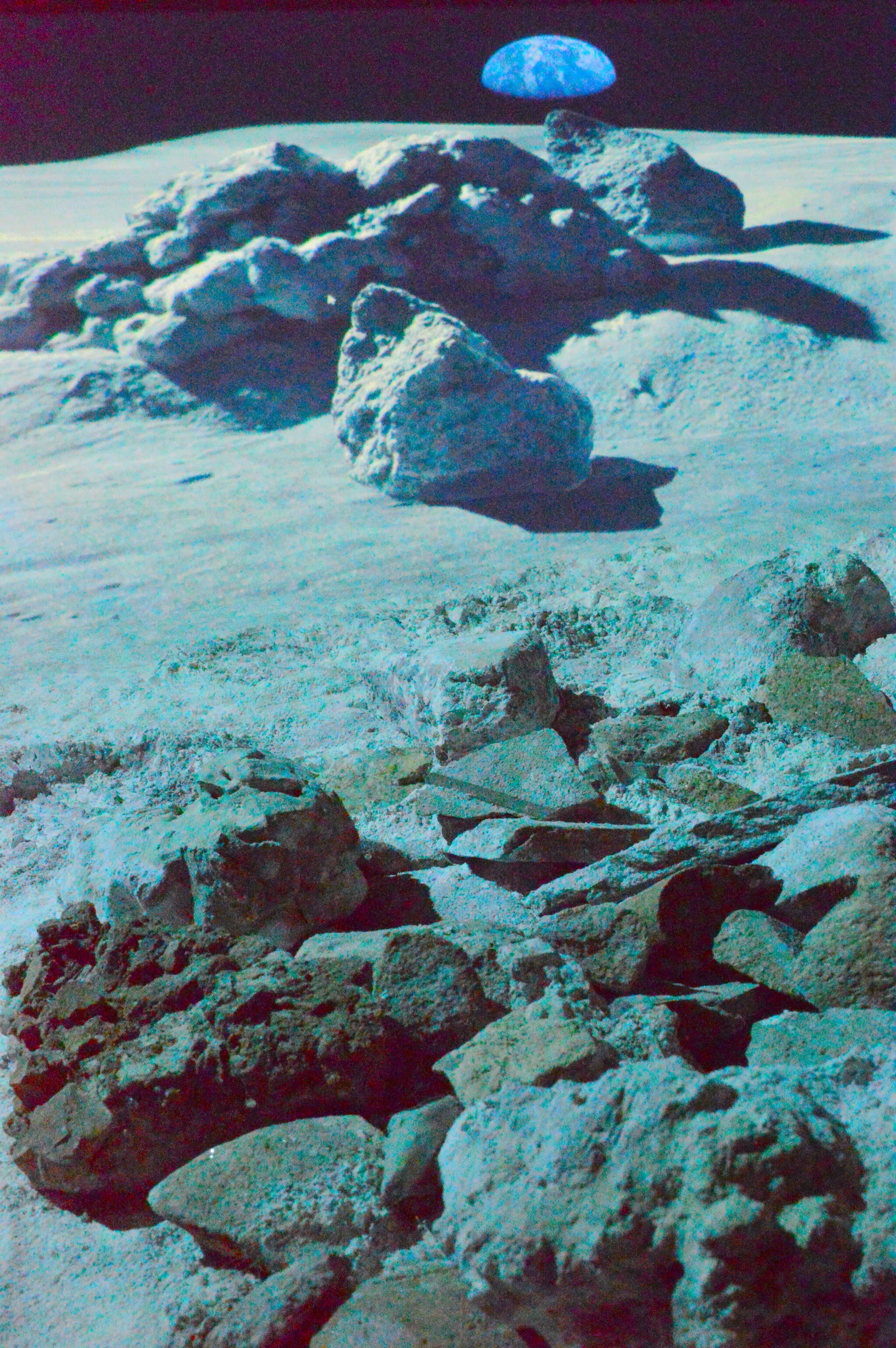 Данная панорама имеет уникально точную цветопередачу, предсказанную еще в 1959 советскими учеными селенологами - диск Земли в диаметре в шесть раз больше видимого на земном небосконе диска Луны. И если Луна земной ночью работает чем то вроде слабого ночника, то диск Земли заливает лунную поверхность мощным голубым свечением.