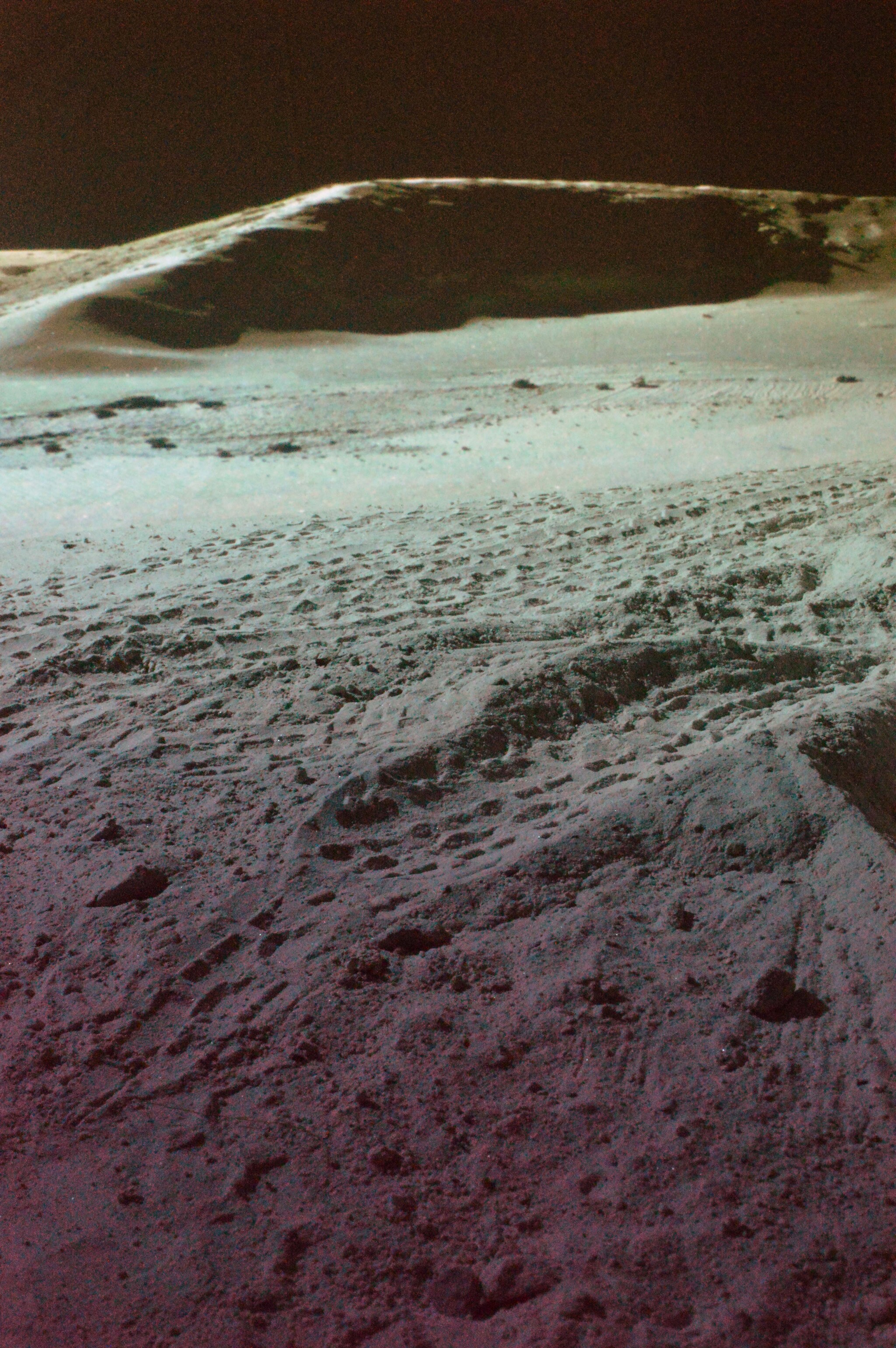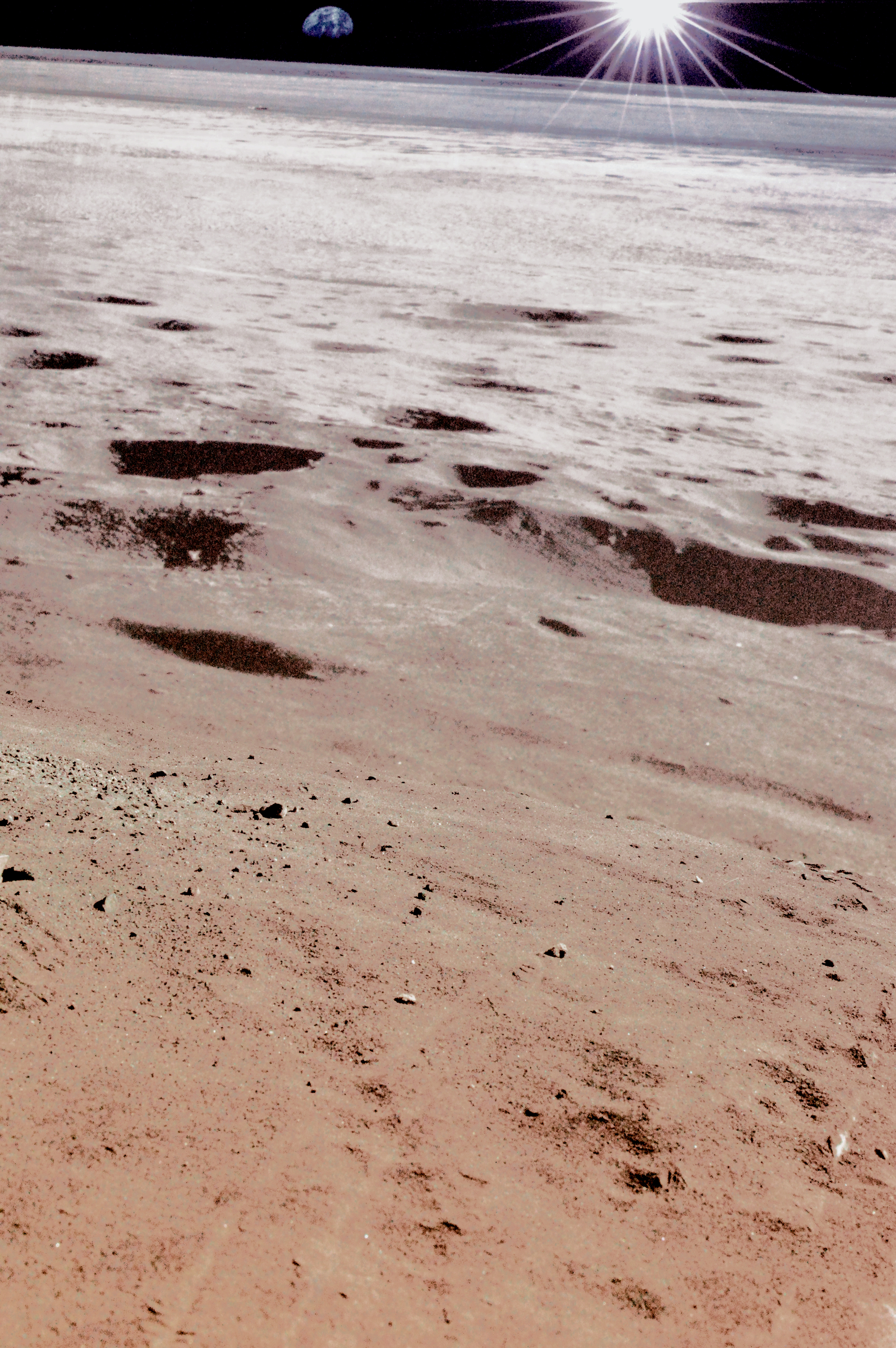 При ближайшем осмотре астронавты обнаруживают, что поверхность Луны имеет цветовые оттенки, отличные от нейтрального серого цвета: коричневый, голубоватый и другие.