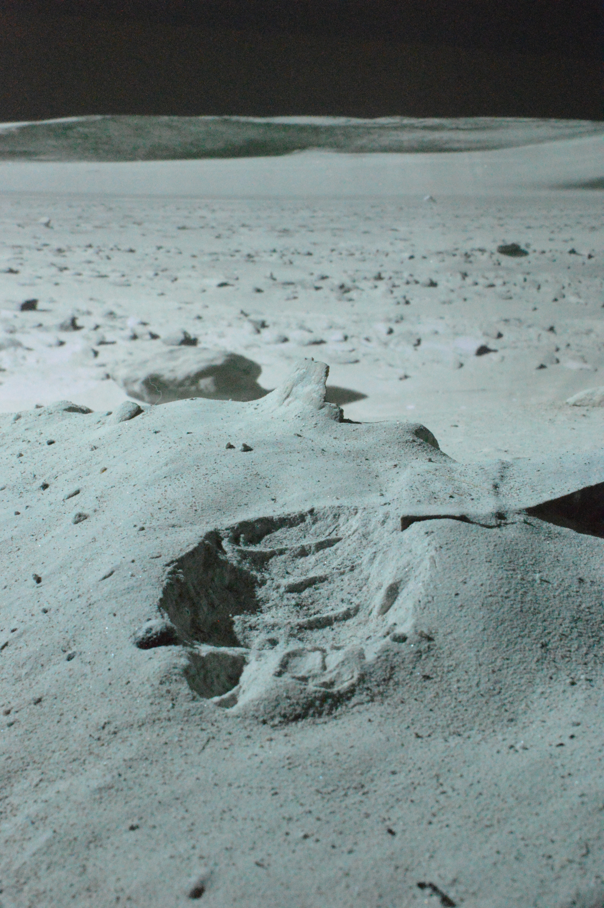 Хорошо пропечатанный в лунном грунте след астронавта на лунной поверхности. Панорама передана луноходом Москва.