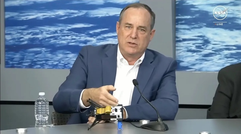 Стив Альтемус, генеральный директор Intuitive Machines, использует модель спускаемого аппарата компании Nova-C, чтобы показать его вероятную ориентацию после приземления. 22 февраля. Предоставлено: NASA TV