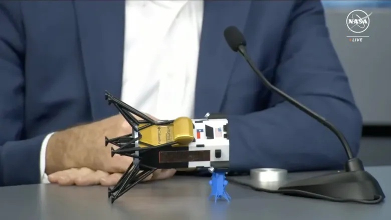 Крупным планом модель лунного спускаемого аппарата IM-1 на боку, показывающая его вероятную ориентацию на поверхности. Фото: NASA TV