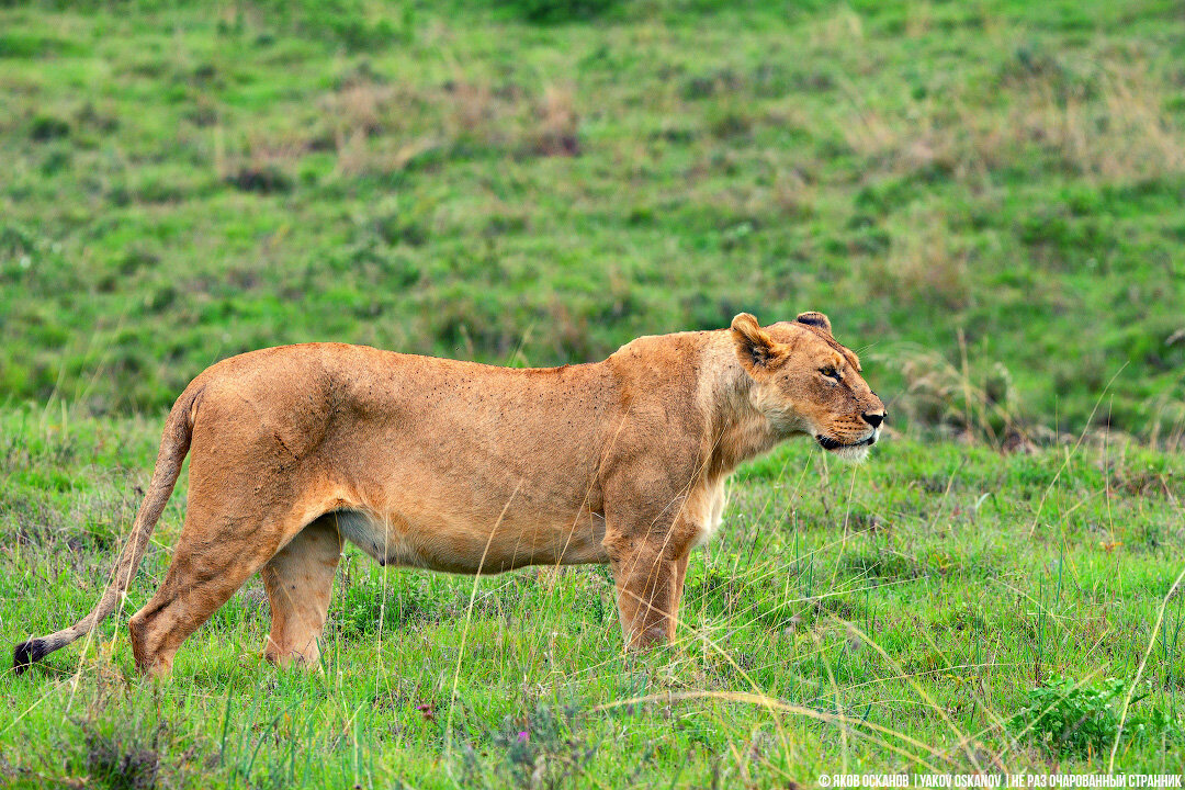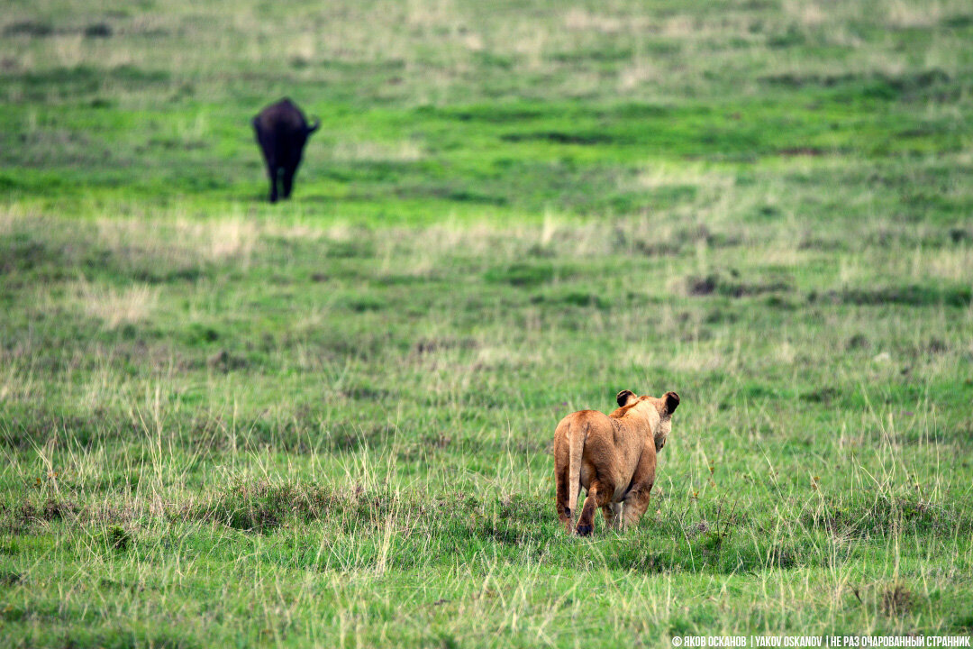 Одна из львиц шла быстрее прочих, чуть впереди. Другие же с ленцой прогуливались вдоль склона. Мы проследили взглядом по направлению их движения и увидели пасущегося буйвола-одиночку.