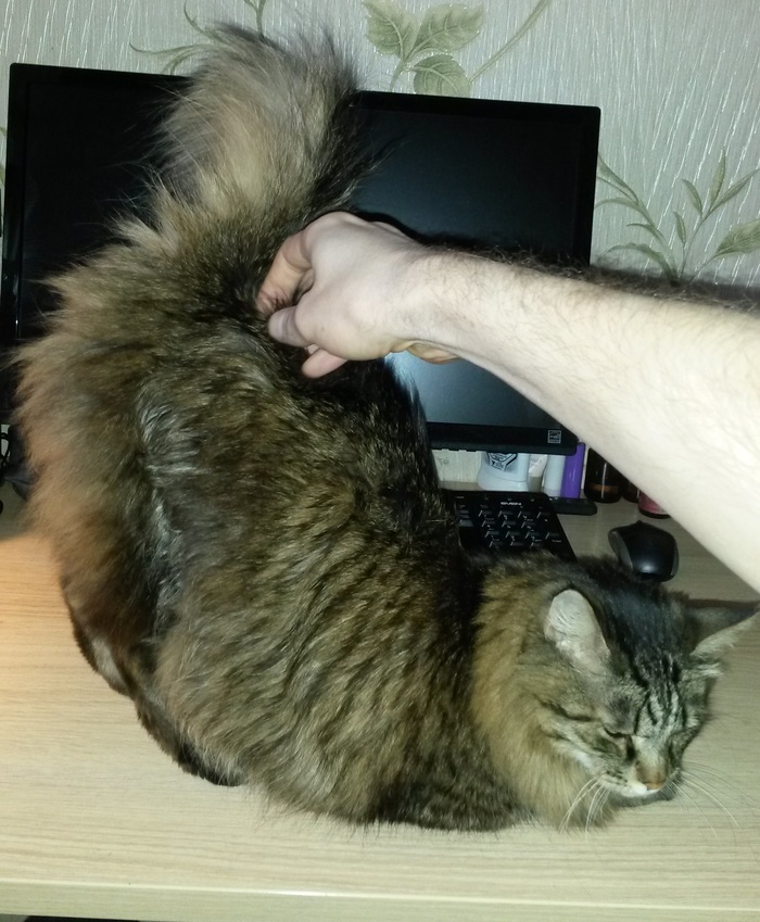 Кота чешут по хребтине, он прется. Немного слежался во время сна.