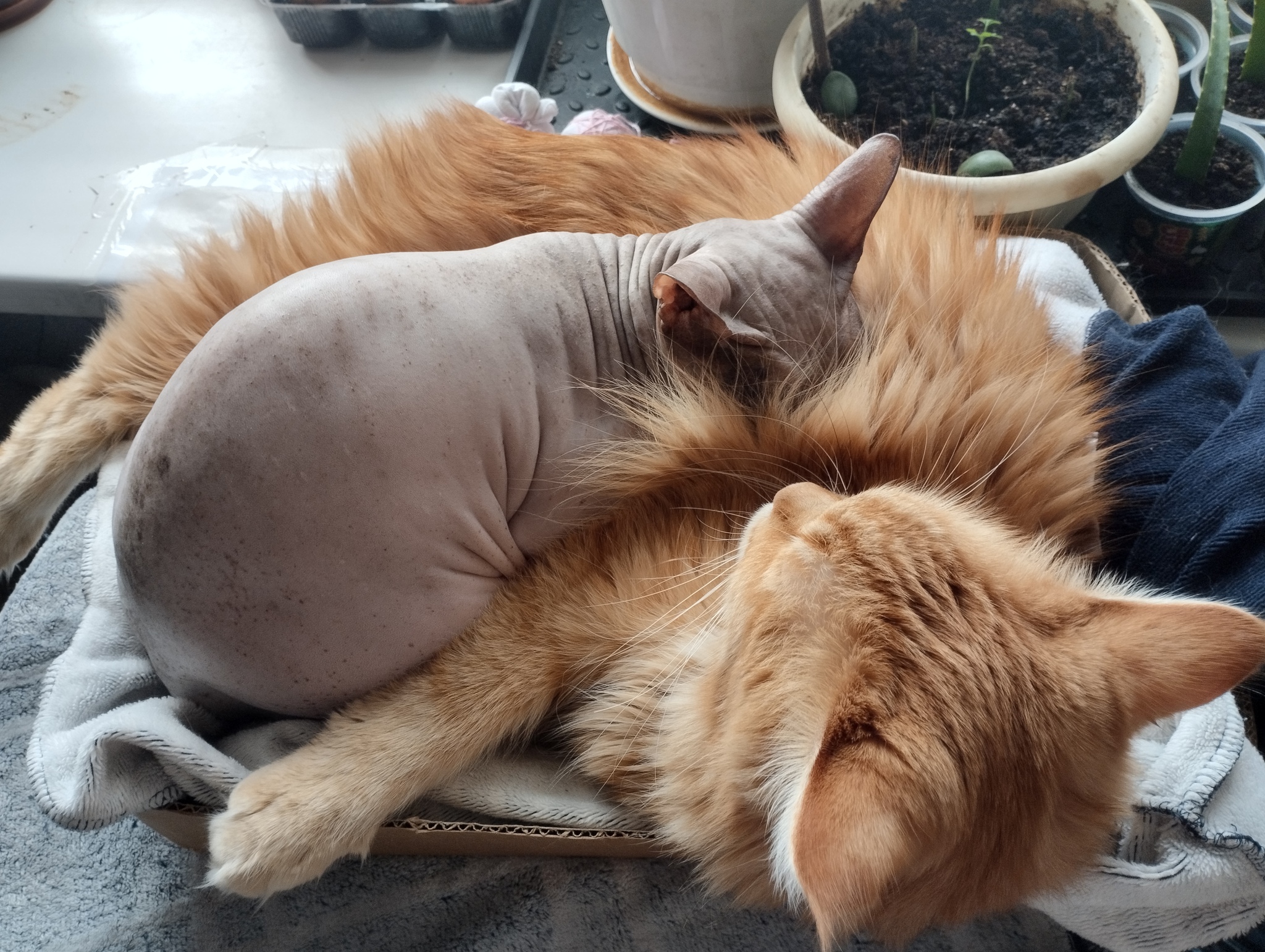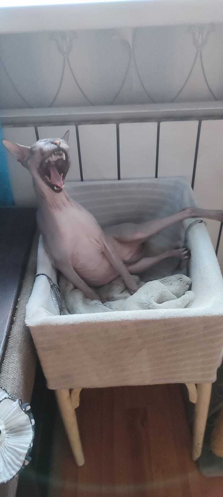 В 2019 году, можно сказать, на последние деньги, я взяла маленькое лысое чудо. Когда приехала её забирать - вышла хозяйка, а на её груди, всеми четырьмя лапами, выпустив коготки, как морская звезда, висела моя Исида) Она лысая, но "беспородная", как вопят умные фелинологи - мне по барабану чьих кровей моя кошка, раз лысая - значит сфинкс, а раз сфинкс и мой хозяин идиот - то почему-то имя, по классике египетское)))