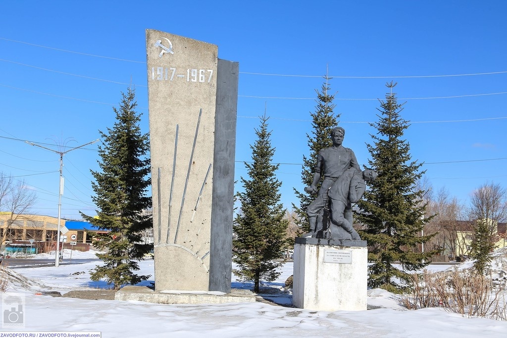 Памятник «Героям Гражданской войны» был сооружен и торжественно открыт 25 октября 1967 года в дни празднования 50-летнего юбилея Октябрьской революции. Скульптурная группа из двух фигур выражает тему: «Умираю, но не сдаюсь». За основу сюжета автором взят подвиг героического экипажа бронепоезда № 2. Автор памятника – местный скульптор Л.А. Кузнецова. Скульптурная группа отлита на металлургическом заводе литейщиками фасонно-литейного цеха.
