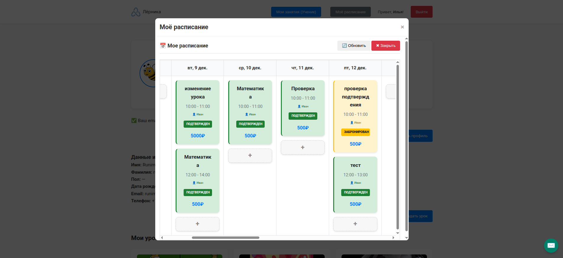 сделал следующую стадию: Календарь. учитель может сделать слот с занятием, назначить тему, цену, время, ученика. Ученик, в свою очередь, должен этот урок подтвердить.