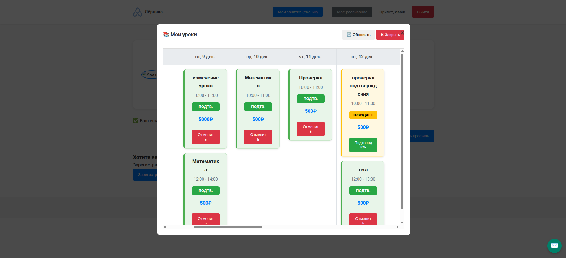 желтый, как вы понимаете, неподтвержденный урок. он ожидает подтверждения от ученика, чуть позже добавлю туда клавишу "подключиться к видеоконференции".
