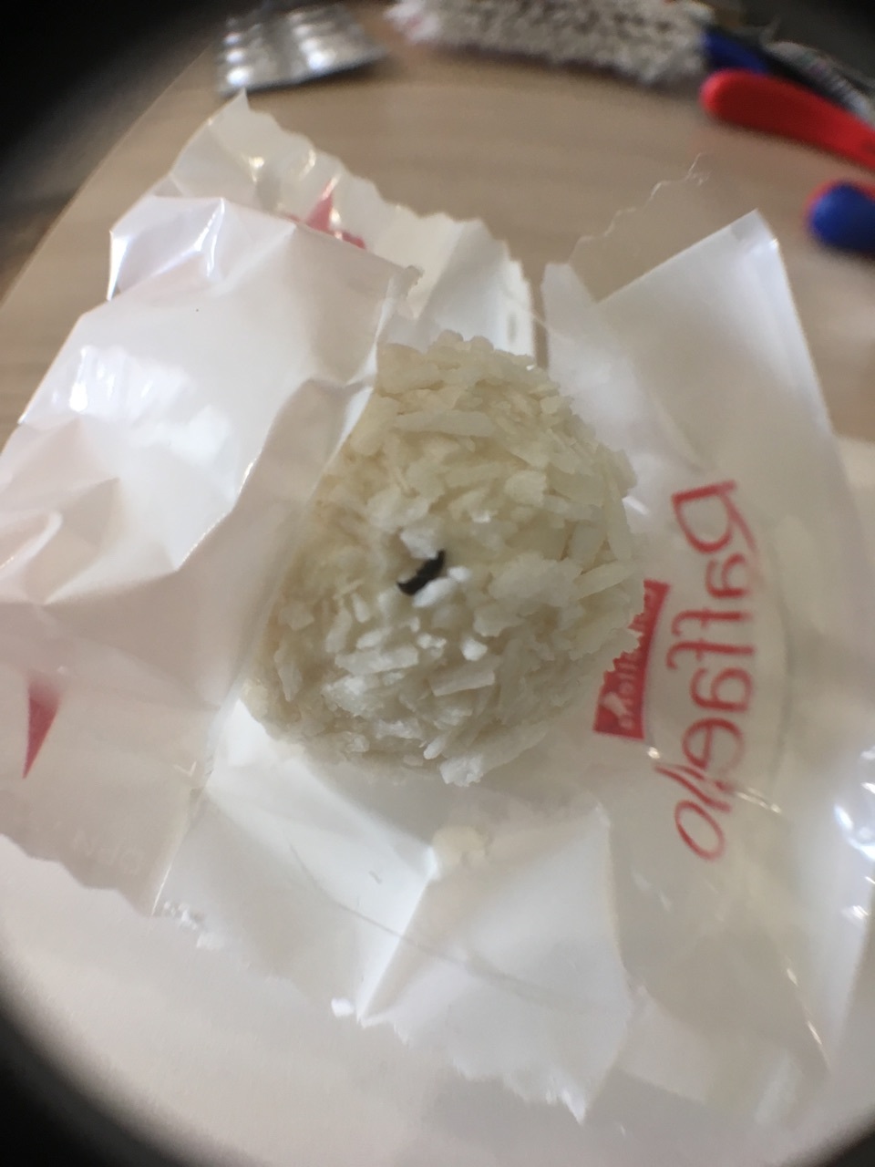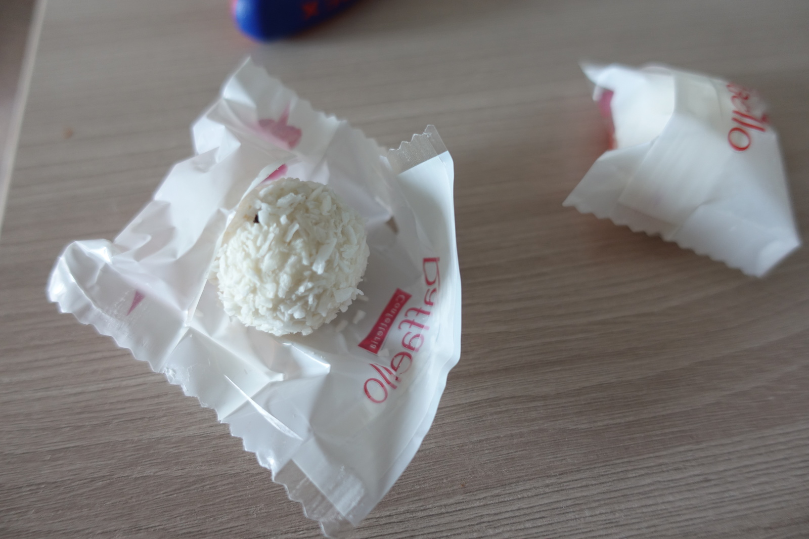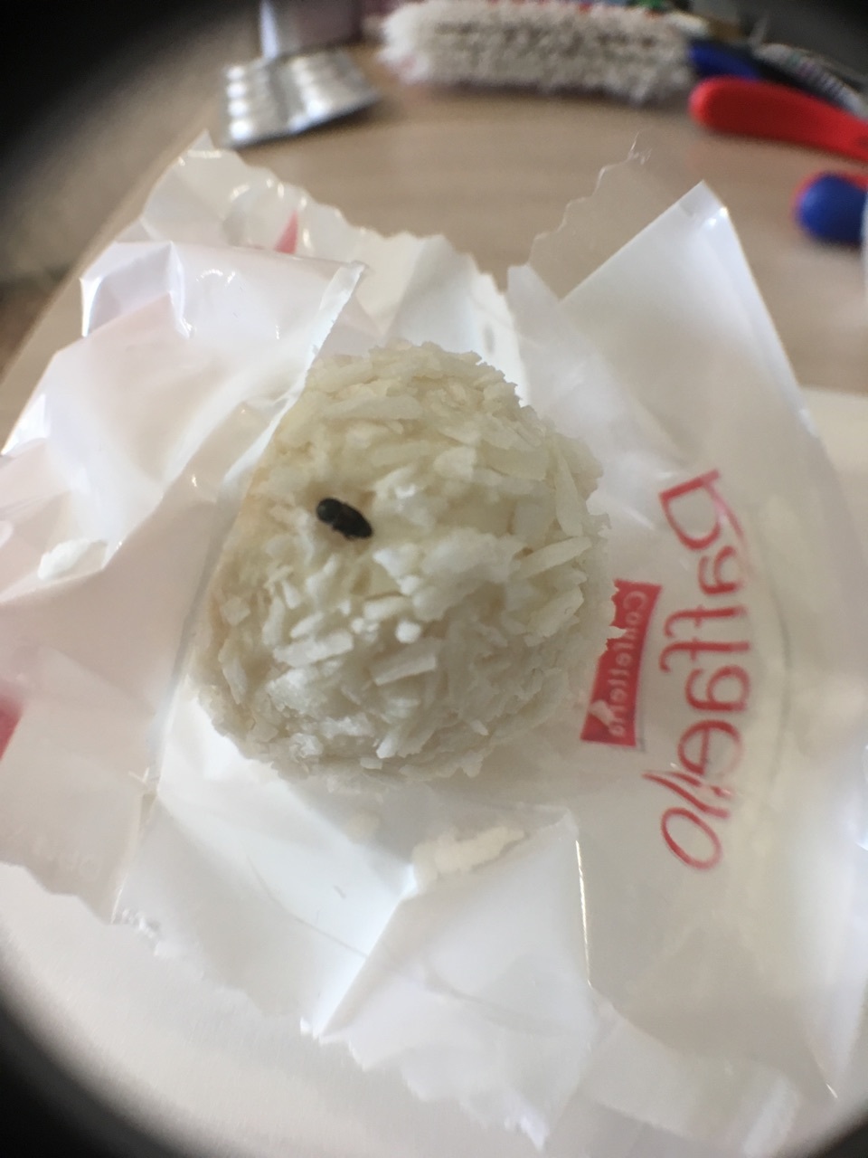 На днях я открыл очередную коробочку вкусняшек. А сегодня там оказались три последние конфетки. Одна из которых показалась не слишком аппетитной. На белоснежном фоне кокосовой стружки что-то темнело.