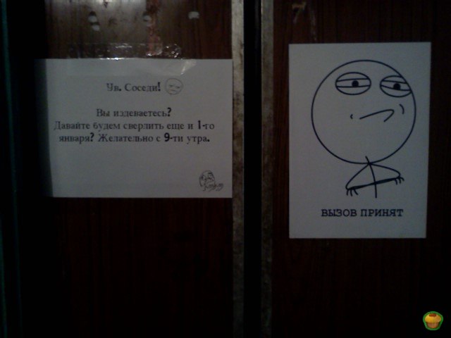 2124 Zooeva Любимые соседи 13 лет назад Когда сверлили в любой день недели и в любое время дня... я распчатала и приклеила на лифт бумажку, которая слева. Через 2 часа у нее появился сосед) [моё] Картинки и фото