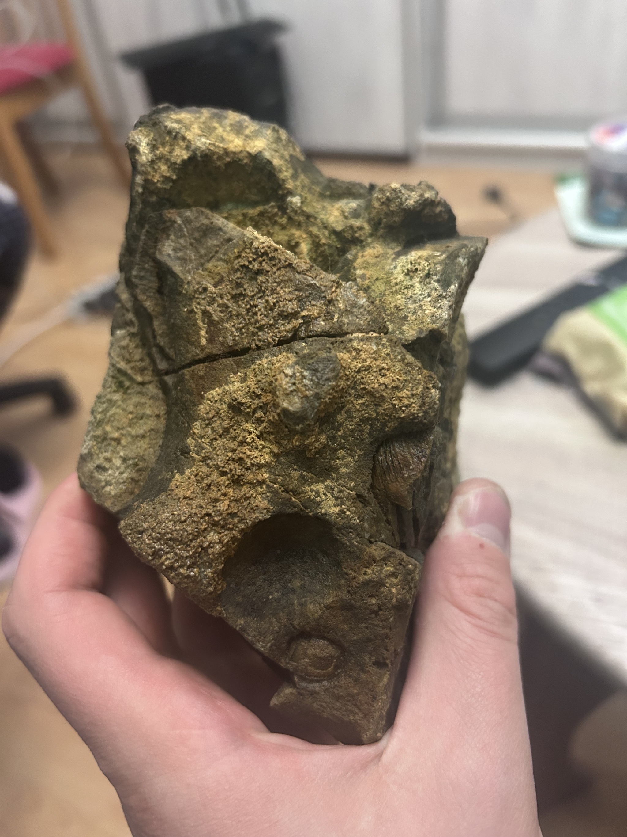 На выходных откопал вот такие экземпляры. Порода отличается от той, в которой искал, есть вкрапления брахиопод, но вот что это, никак понять не могу, нужна сила Пикабу.