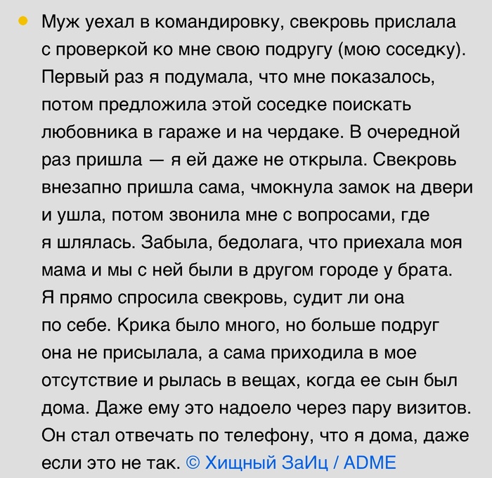 В 1998 оду стала жить с будущим мужем в его квартире. У его родителей были ключи. Так меня попрекали моими трусами на верëвке в ванной. Главное, что его трусы сушатся- это норм, в мои вверх неприличия. Видимо,их надо было или сжигать или закапывать глубоко в землю) сейчас у нас дочь 21 год, но я никогда не лезу в еë нижнеë бельë, как и в белъë еë парня.