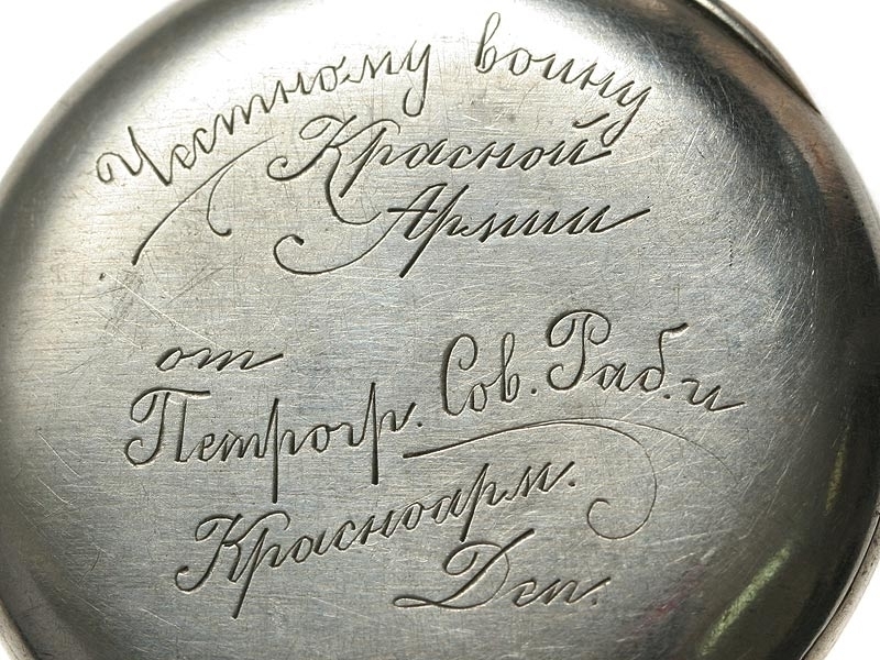 Следует заметить, что во время гражданской войны в качестве наград чаще всего вручали часы и портсигары, реже – наградное оружие. Часы и портсигары брали из экспроприированных/конфискованных запасов часовых и ювелирных компаний и магазинов. При награждении на часы и портсигары наносили надписи, аналогичные показанной выше, порой тем же шрифтом – что говорит о том, что дело было поставлено на поток, и обычно награды были обезличенные. Часто такие награды подписывались именем Петросовета, но встречаются также подобные награды от ВЦИК, Моссовета и т.п.