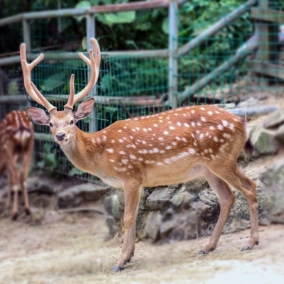 Рыжевато-коричневый,с маленькими ушами, (но вдруг они развернутся через день??) высовывается из большого рыжевато-коричневого тела(мама??) , на котором маленькие белые пятна. На фОто попа оленя похожа.