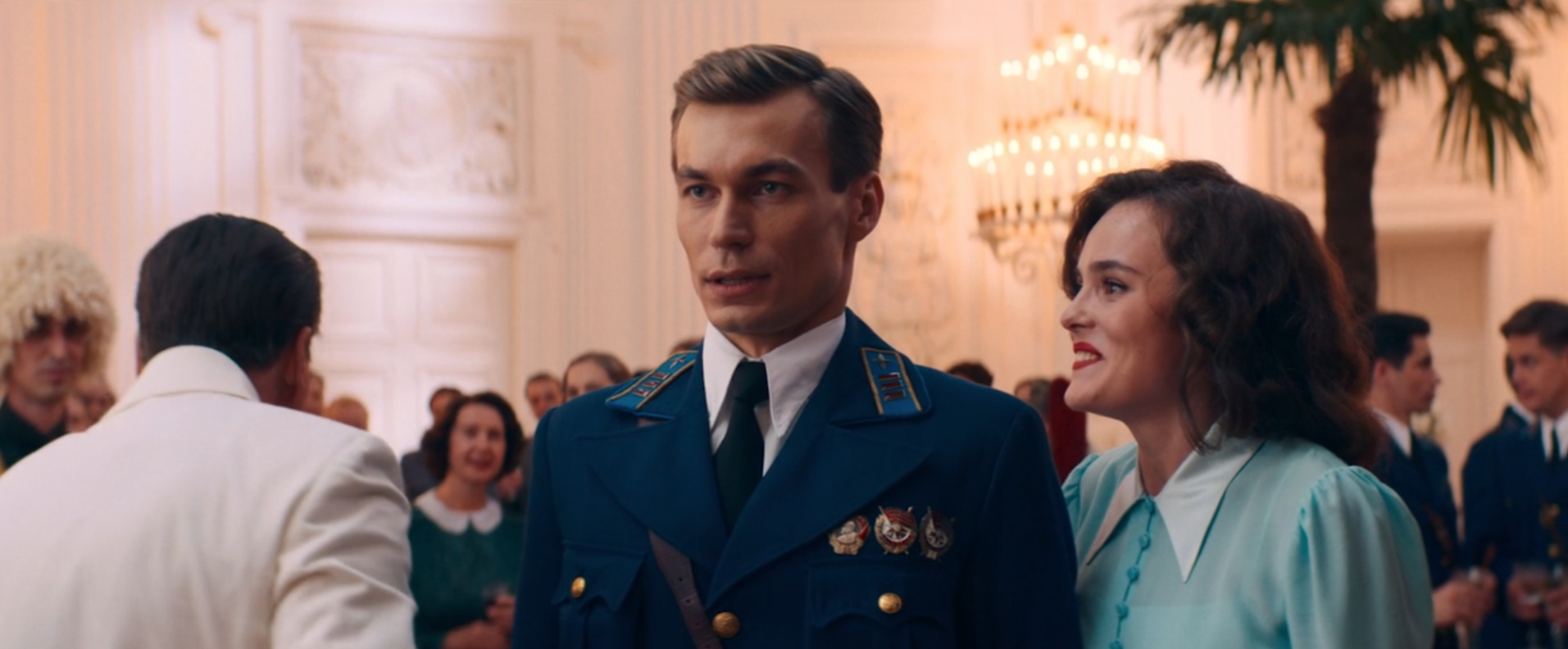 Потом герои познают тяготы войны. Кирилл бегает по пшеничному полю под минометным обстрелом, Галина ходит в шали по подарочной сталинской квартире с тревожным лицом. В какой-то момент они встречаются для любви и опять немножко для Сталина.