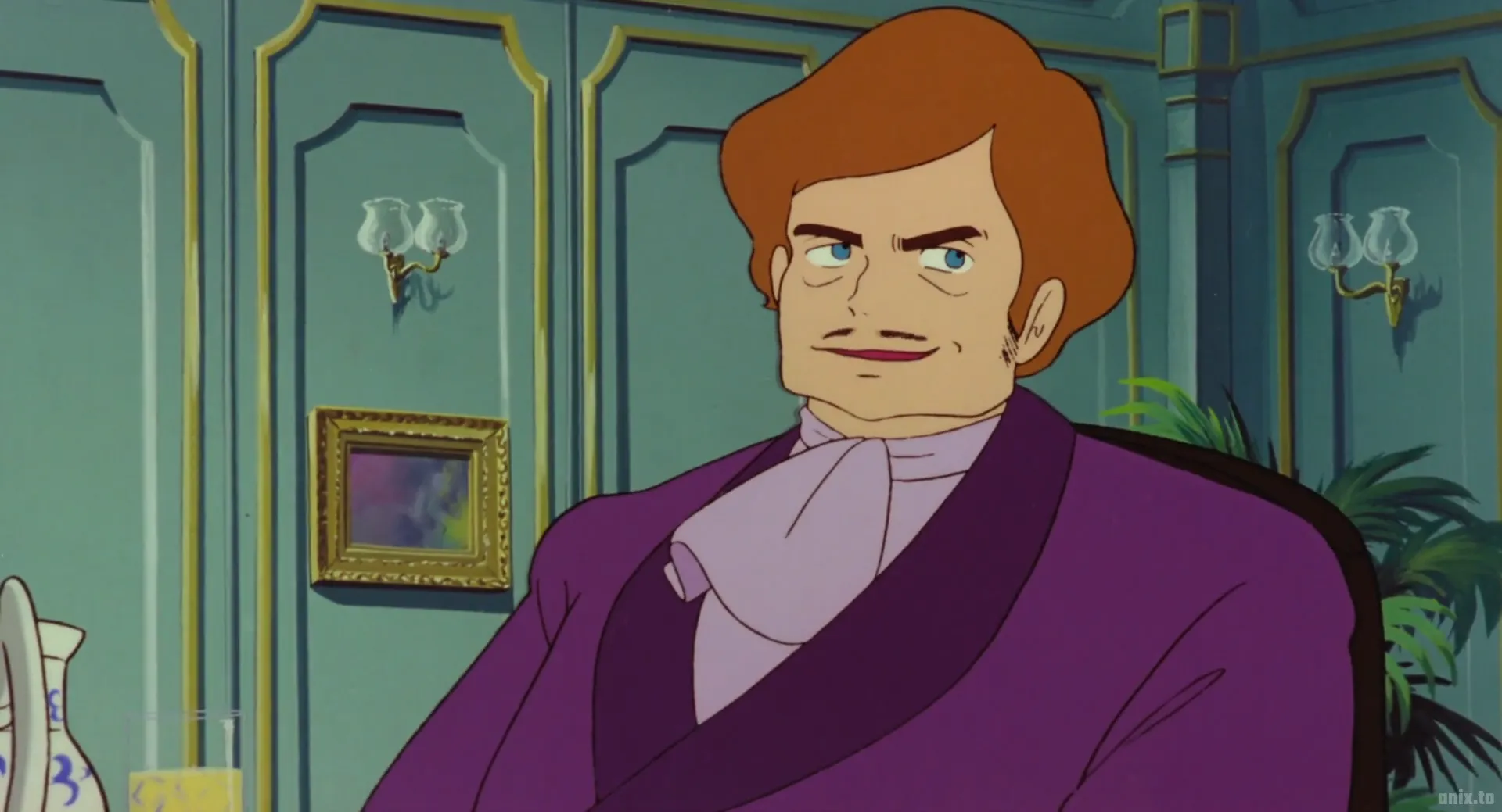 А злодей, как и положено у Миядзаки, обычный человек, который хочет власти и денег. И один-в-один администратор Лепка из "Конана". Он не тотальный негодяй, который творит зло ради зла, но и хороших черт у него особо не выделишь.