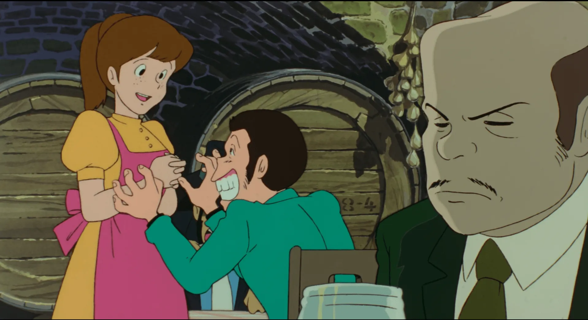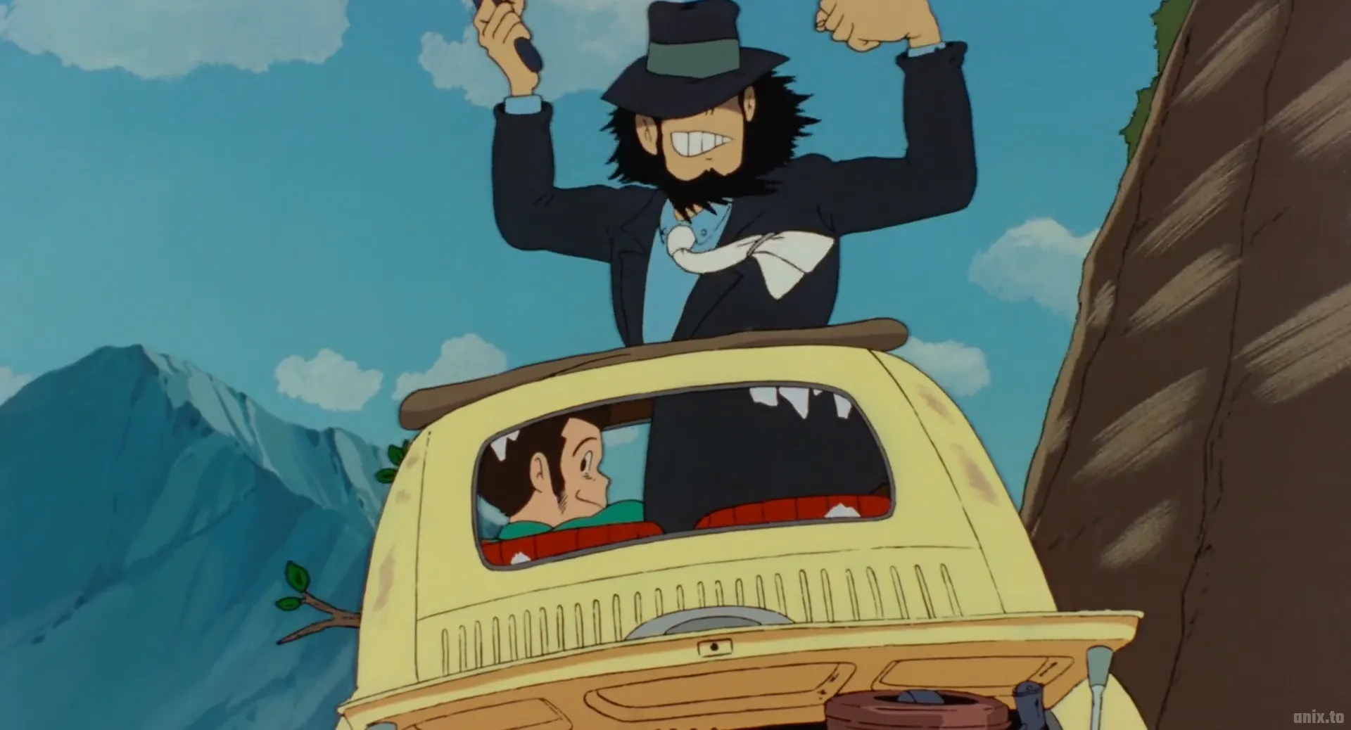 Особенно изменился Люпен. Как я уже говорил, бабник и плут в пиджаке не очень-то нравился Миядзаки, поэтому здесь режиссер попытался его исправить. Подразумевается, что с возрастом Люпен слегка остепенился, перестал устраивать вычурные выходки и больше теперь раскрывает свою романтичную сторону. Это даже подчеркивает его автомобиль Фиат 500, который сменил Мерседес из предыдущего фильма. Мерседес SSK — это вычурная, дорогая машина, в отличие от маленького и скромного Фиата. Да и к женщинам теперь не пристает всё время, хотя не прочь поразвлечься с официанточкой. Теперь он в общем не антигерой со своими изъянами, а герой на белом коне.