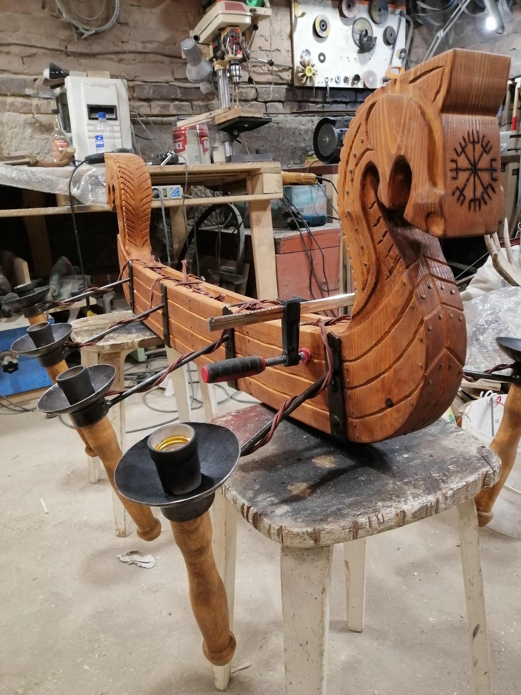 Важно понимать, что это не копирование средневековой ладьи, а стилизация люстры. Грубо кованые элементы, заклепки, подсвечники, похожие на весла!..