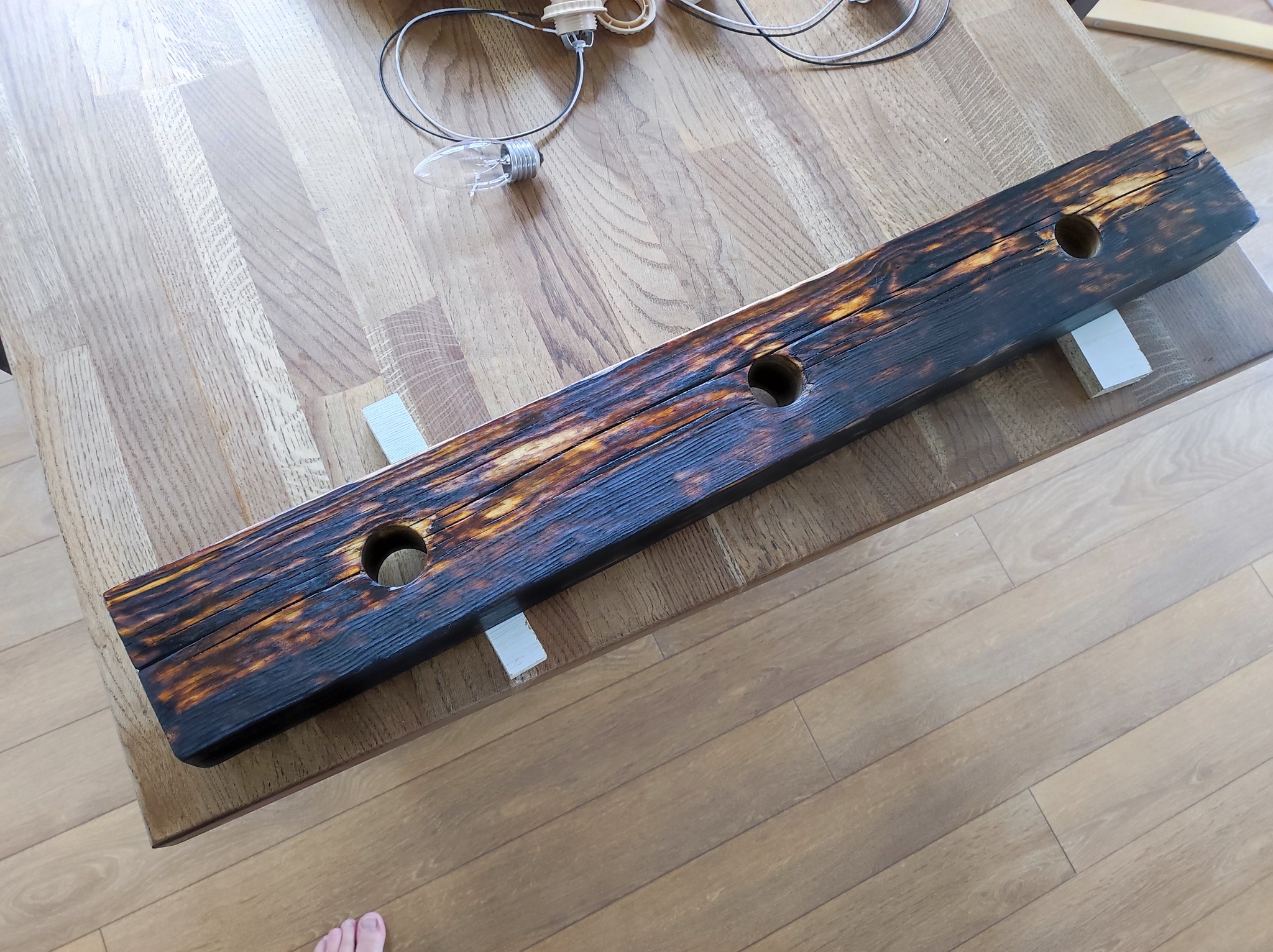 Далее хорошенько прожег брусок горелкой
